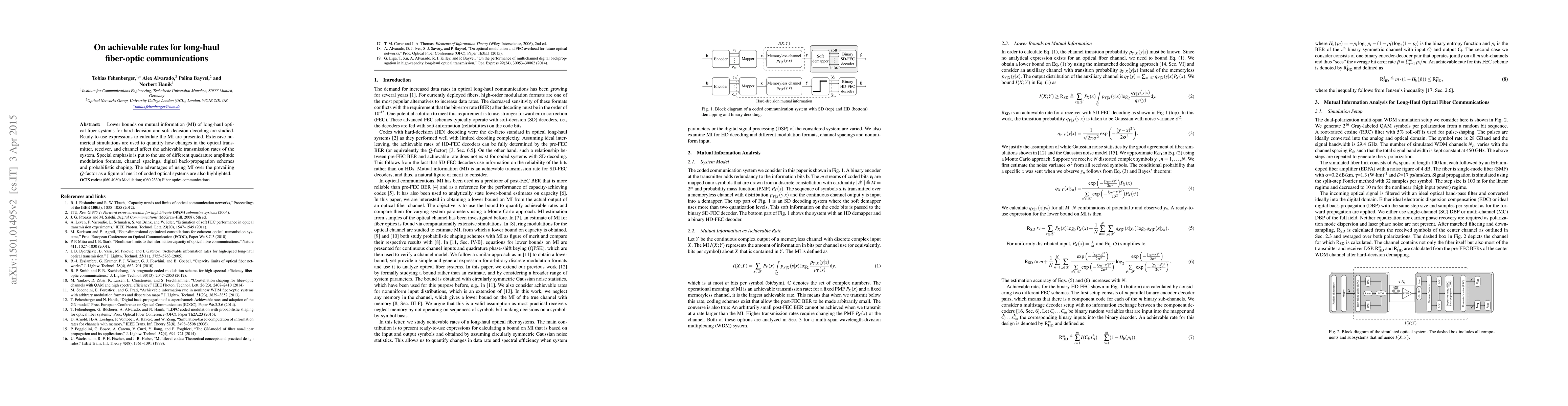This paper presents lower bounds on mutual information for long-haul fiber-optic systems under both hard-decision and soft-decision decoding, offering practical expressions to calculate it. It highlights the impact of various modulation formats and digital back-propagation schemes on achievable transmission rates, advocating for mutual information over the $Q$-factor as a better performance metric.