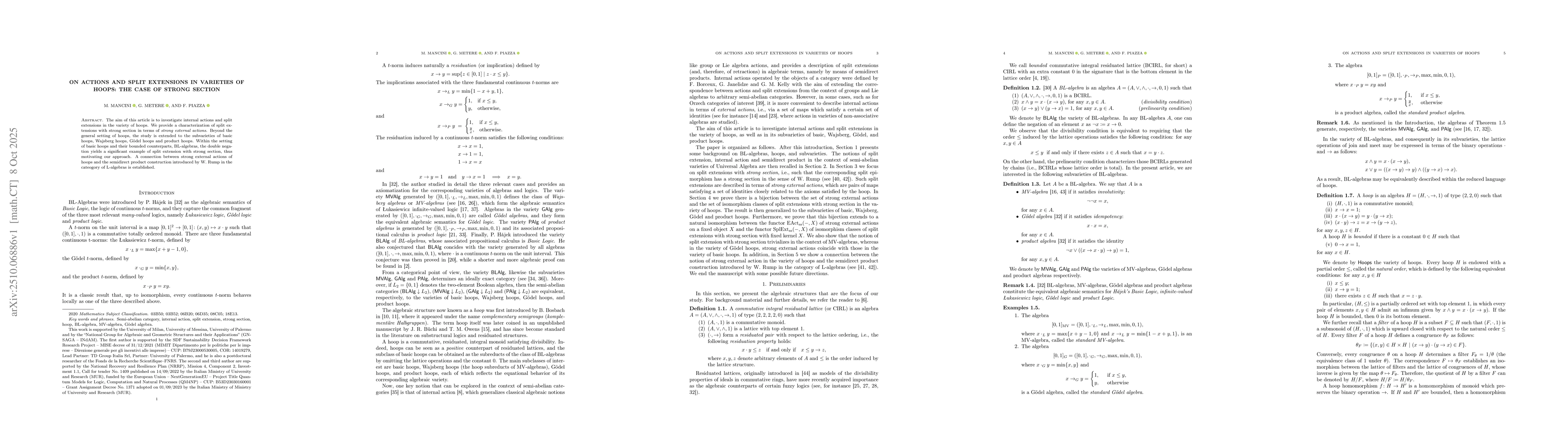 The paper introduces a novel correspondence between split extensions with strong sections and external actions, establishing natural isomorphisms that reveal deep structural relationships in varieties of hoops.