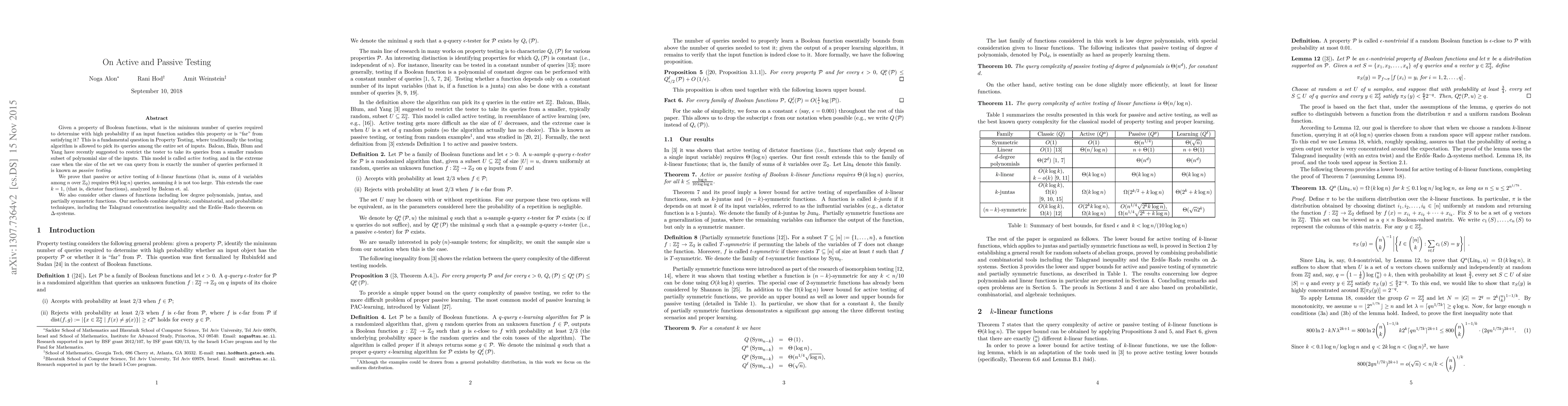 This paper explores the minimum number of queries needed for active and passive testing of Boolean functions, focusing on k-linear functions. It proves that Theta(k*log n) queries are required for such testing, extending previous results for dictator functions. The study also employs algebraic, combinatorial, and probabilistic techniques to analyze other function classes.