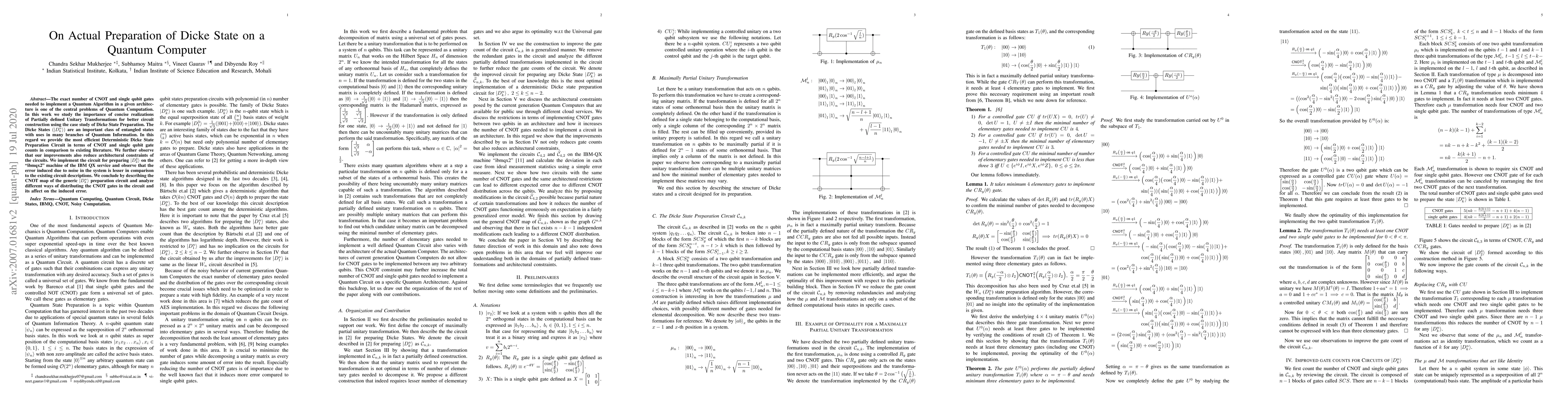 This research presents the most efficient circuit for preparing Dicke states on a quantum computer, significantly reducing the number of CNOT and single qubit gates compared to existing methods. The study demonstrates improved error reduction on the IBM QX "ibmqx2" machine and analyzes the impact of CNOT gate distribution on circuit performance.