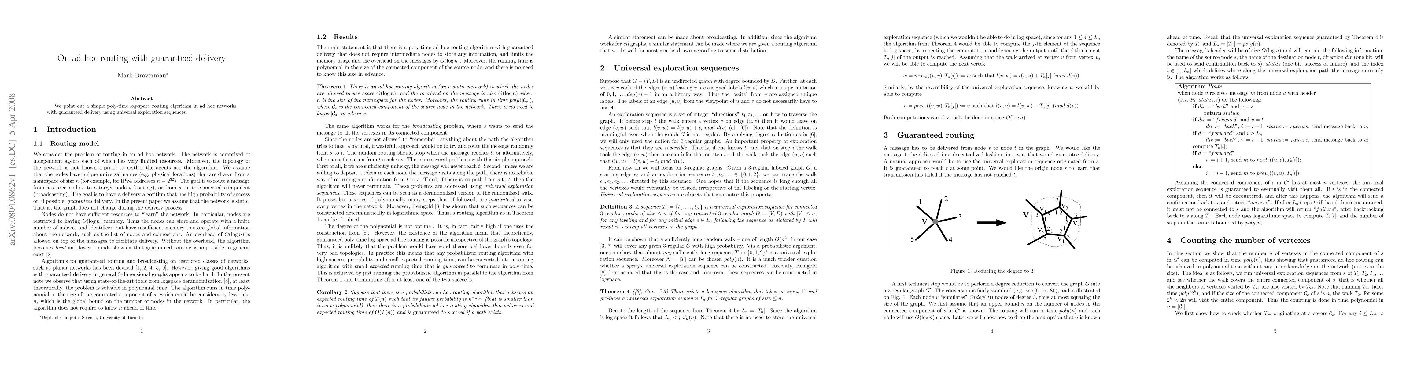 Summary: This paper presents a poly-time log-space routing algorithm for ad hoc networks that ensures guaranteed delivery through the use of universal exploration sequences. The method aims to simplify routing while maintaining reliability.