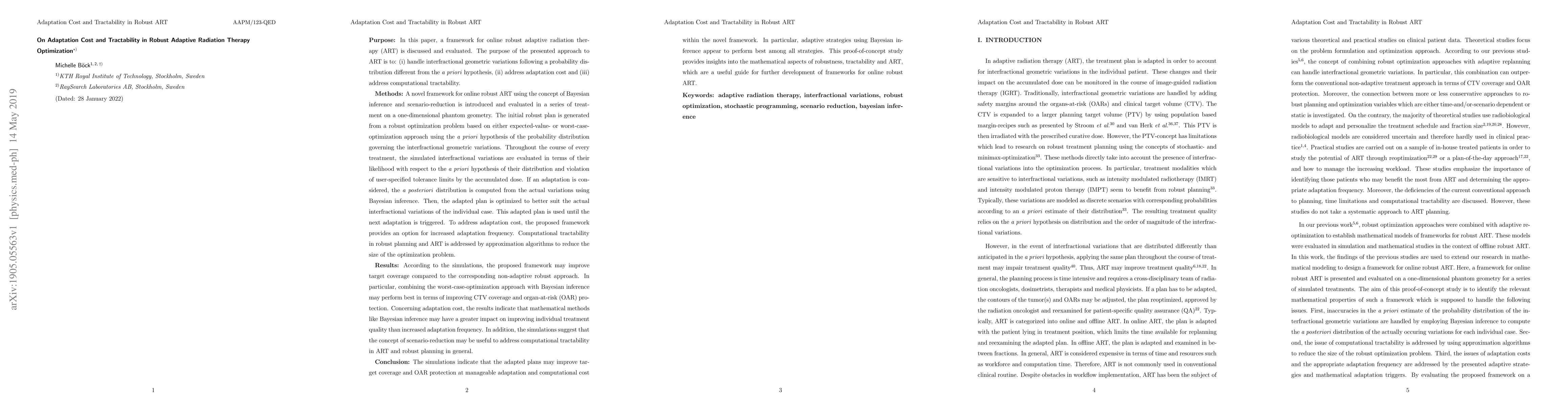 This paper proposes a robust adaptive radiation therapy optimization framework using Bayesian inference and scenario-reduction to handle interfractional variations and manage adaptation costs. The framework improves target coverage and organ-at-risk protection through adaptive optimization, with Bayesian inference showing a significant impact on cost management.