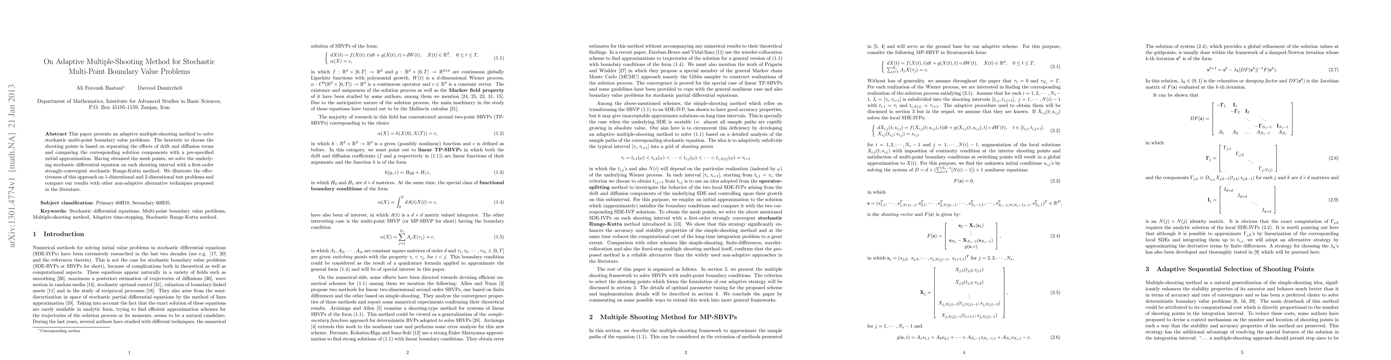 This paper introduces an adaptive multiple-shooting method for solving stochastic multi-point boundary value problems, optimizing shooting points based on drift and diffusion term separation. The method employs a first-order strongly-convergent stochastic Runge-Kutta solver and demonstrates effectiveness through 1D and 2D test problems, outperforming non-adaptive alternatives.