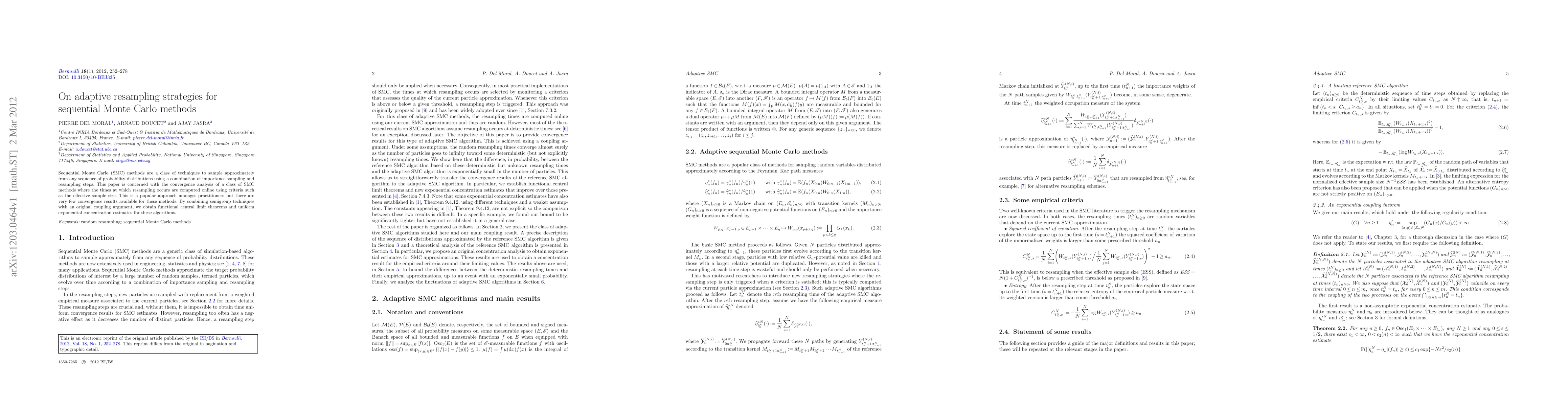 This paper investigates adaptive resampling strategies for Sequential Monte Carlo methods, focusing on their convergence properties. It establishes functional central limit theorems and uniform exponential concentration estimates using semigroup techniques and a novel coupling argument.