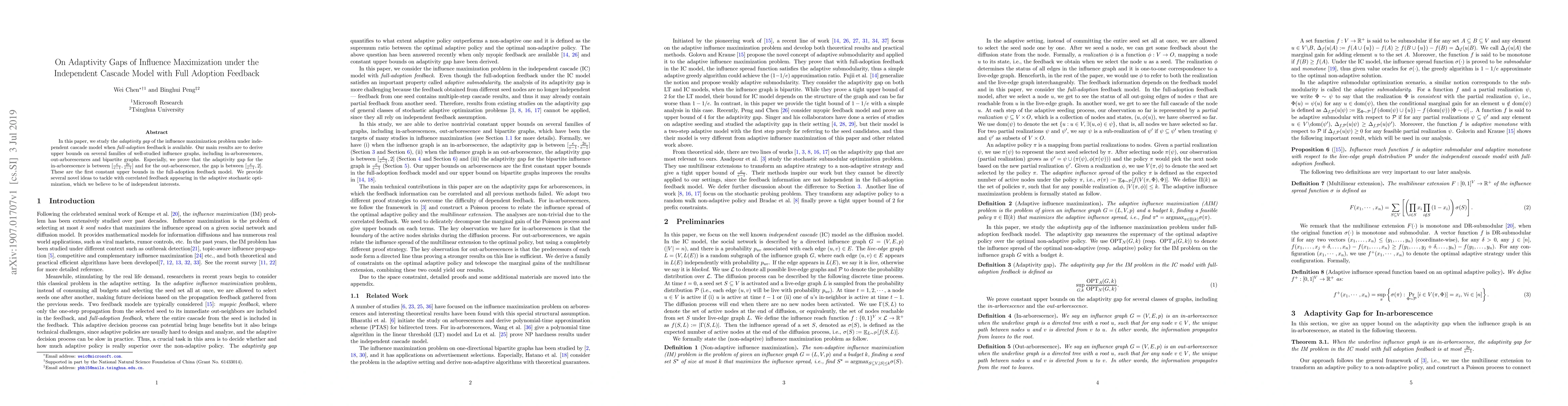 This paper investigates the adaptivity gap in the influence maximization problem under the independent cascade model with full-adoption feedback. It establishes the first constant upper bounds for adaptivity gaps in several influence graph families, notably proving bounds for in-arborescences and out-arborescences.