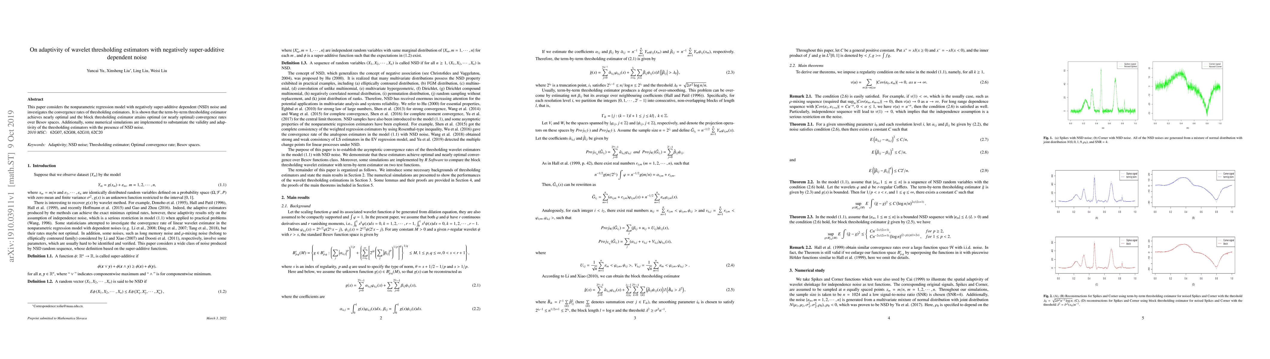 This paper examines the adaptivity of wavelet thresholding estimators in nonparametric regression models with negatively super-additive dependent noise, demonstrating nearly optimal convergence rates for term-by-term and optimal or nearly optimal rates for block thresholding estimators over Besov spaces, supported by numerical simulations.
