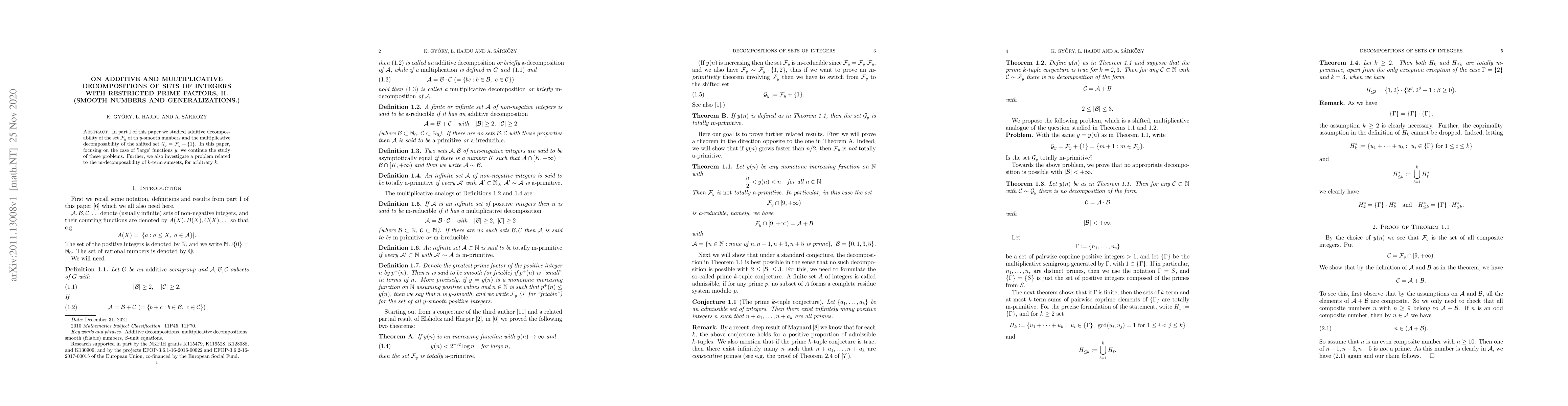 This paper continues the study of additive and multiplicative decomposability of sets of integers with restricted prime factors, specifically focusing on large functions $y$. It examines the decomposition properties of $y$-smooth numbers and related shifted sets, and explores the $m$-decomposability of $k$-term sumsets for any $k$.