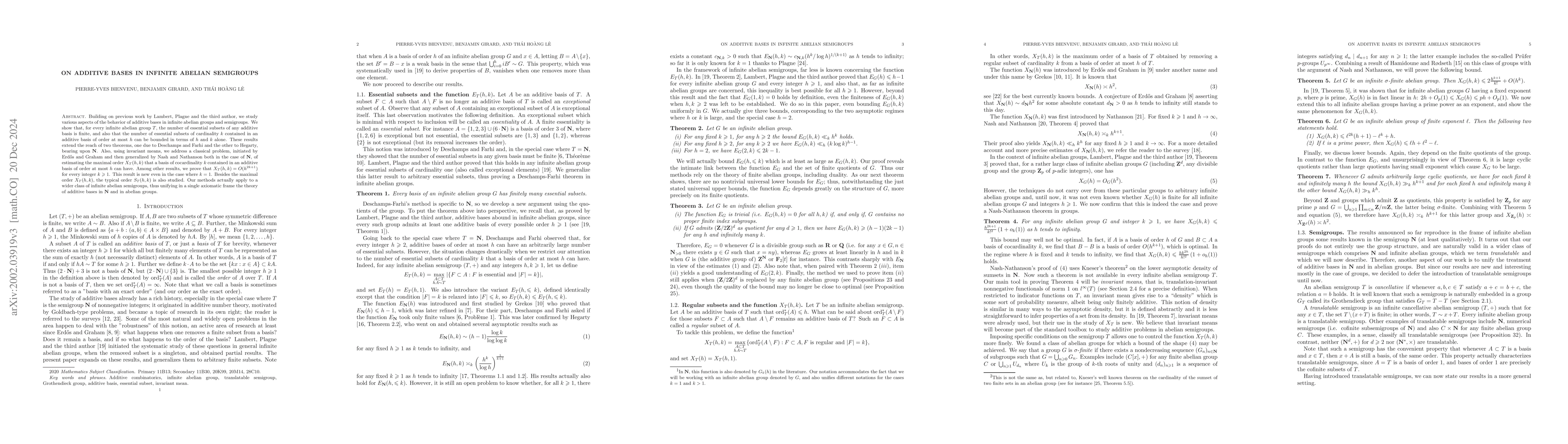Building on previous work by Lambert, Plagne and the third author, we study various aspects of the behavior of additive bases in infinite abelian groups. We show that, for every such group $T$, the number of essential subsets of any additive basis is finite, and also that the number of essential subsets of cardinality $k$ contained in an additive basis of order at most $h$ can be bounded in terms of $h$ and $k$ alone. These results extend the reach of two theorems, one due to Deschamps and Farhi and the other to Hegarty, bearing upon $\mathbf{N}$. Also, using invariant means, we address a classical problem, initiated by Erd\H{o}s and Graham and then generalized by Nash and Nathanson both in the case of $\mathbf{N}$, of estimating the maximal order $X_T(h,k)$ that a basis of cocardinality $k$ contained in an additive basis of order at most $h$ can have. Among other results, we prove that $X_T(h,k)=O(h^{2k+1})$ for every integer $k \ge 1$. This result is new even in the case where $k=1$. Besides the maximal order $X_T(h,k)$, the typical order $S_T(h,k)$ is also studied. Our methods actually apply to a wider class of infinite abelian semigroups, thus unifying in a single axiomatic frame the theory of additive bases in $\mathbf{N}$ and in abelian groups.