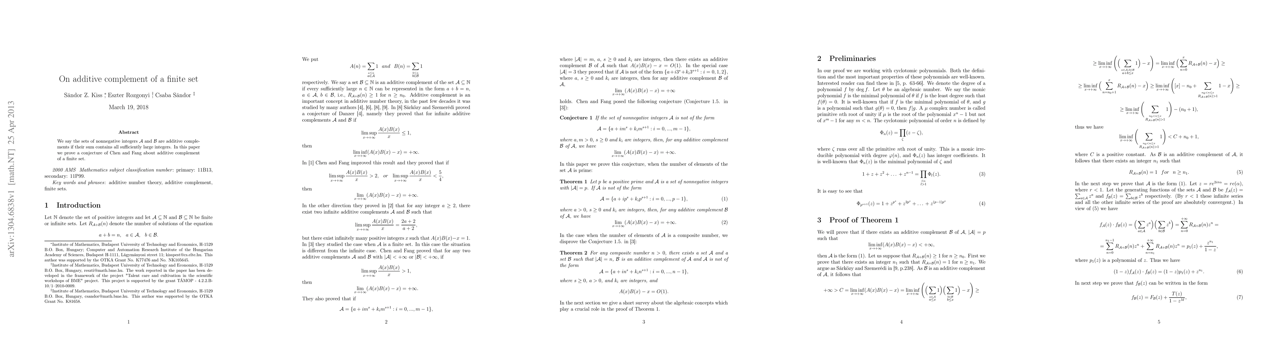 We say the sets of nonnegative integers A and B are additive complements if their sum contains all sufficiently large integers. In this paper we prove a conjecture of Chen and Fang about additive complement of a finite set.