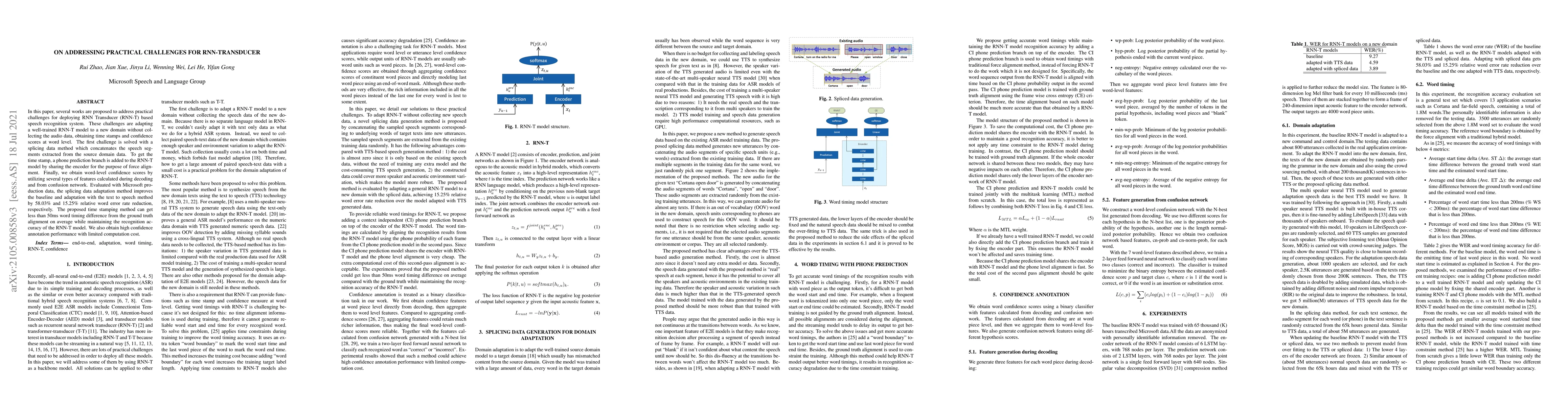 This paper proposes solutions to practical challenges in deploying RNN Transducer (RNN-T) based speech recognition systems, including domain adaptation without new audio data and obtaining word-level time stamps and confidence scores. The splicing data method and a phone prediction branch improve adaptation and time stamping, achieving significant word error rate reductions and accurate word timings.