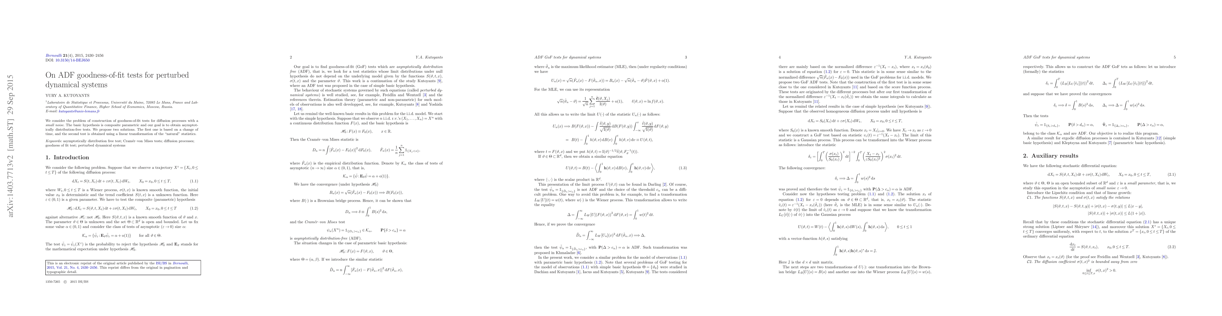 This paper proposes two asymptotically distribution-free goodness-of-fit tests for diffusion processes with small noise, focusing on composite parametric hypotheses. The first solution utilizes a change of time, while the second employs a linear transformation of the natural statistics.