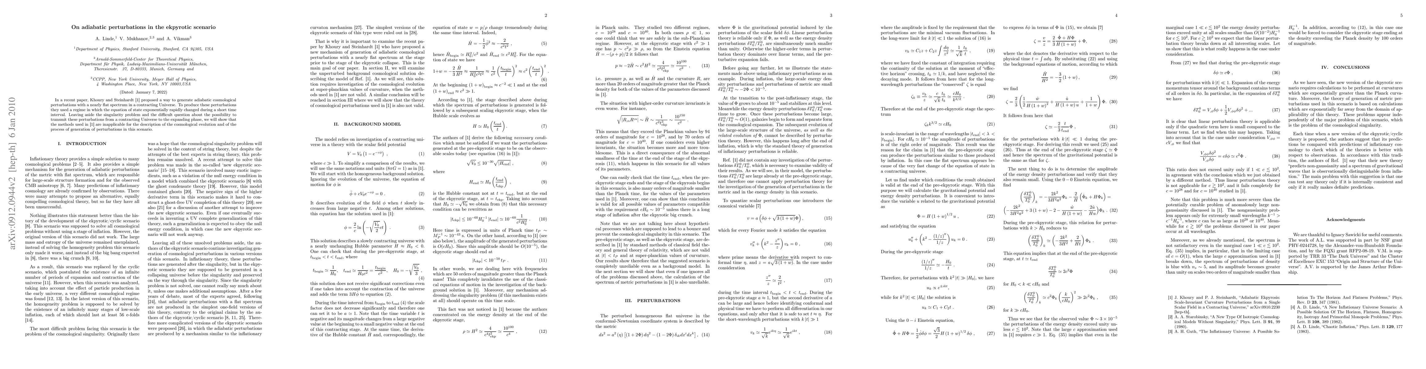 In a recent paper arXiv:0910.2230, Khoury and Steinhardt proposed a way to generate adiabatic cosmological perturbations with a nearly flat spectrum in a contracting Universe. To produce these perturbations they used a regime in which the equation of state exponentially rapidly changed during a short time interval. Leaving aside the singularity problem and the difficult question about the possibility to transmit these perturbations from a contracting Universe to the expanding phase, we will show that the methods used in arXiv:0910.2230 are inapplicable for the description of the cosmological evolution and of the process of generation of perturbations in this scenario.