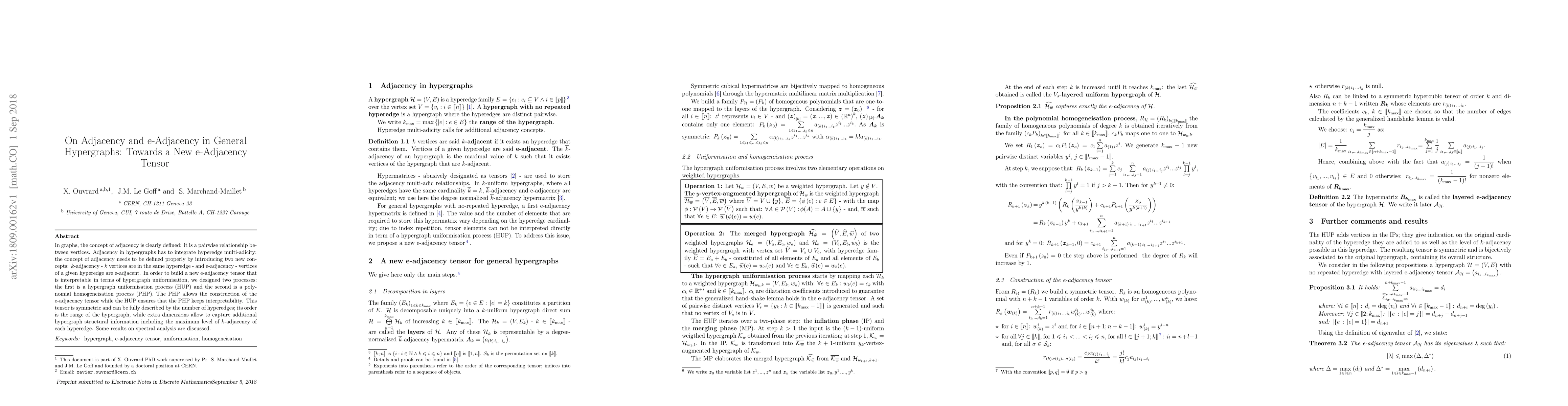 In graphs, the concept of adjacency is clearly defined: it is a pairwise relationship between vertices. Adjacency in hypergraphs has to integrate hyperedge multi-adicity: the concept of adjacency needs to be defined properly by introducing two new concepts: $k$-adjacency - $k$ vertices are in the same hyperedge - and e-adjacency - vertices of a given hyperedge are e-adjacent. In order to build a new e-adjacency tensor that is interpretable in terms of hypergraph uniformisation, we designed two processes: the first is a hypergraph uniformisation process (HUP) and the second is a polynomial homogeneisation process (PHP). The PHP allows the construction of the e-adjacency tensor while the HUP ensures that the PHP keeps interpretability. This tensor is symmetric and can be fully described by the number of hyperedges; its order is the range of the hypergraph, while extra dimensions allow to capture additional hypergraph structural information including the maximum level of $k$-adjacency of each hyperedge. Some results on spectral analysis are discussed.