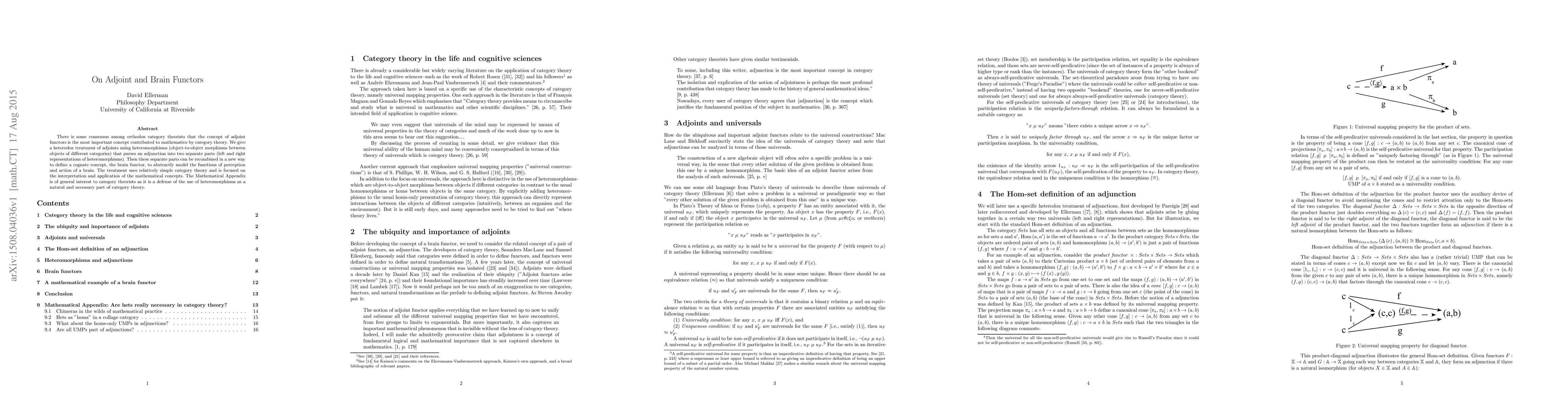 There is some consensus among orthodox category theorists that the concept of adjoint functors is the most important concept contributed to mathematics by category theory. We give a heterodox treatment of adjoints using heteromorphisms (object-to-object morphisms between objects of different categories) that parses an adjunction into two separate parts (left and right representations of heteromorphisms). Then these separate parts can be recombined in a new way to define a cognate concept, the brain functor, to abstractly model the functions of perception and action of a brain. The treatment uses relatively simple category theory and is focused on the interpretation and application of the mathematical concepts. The Mathematical Appendix is of general interest to category theorists as it is a defense of the use of heteromorphisms as a natural and necessary part of category theory.