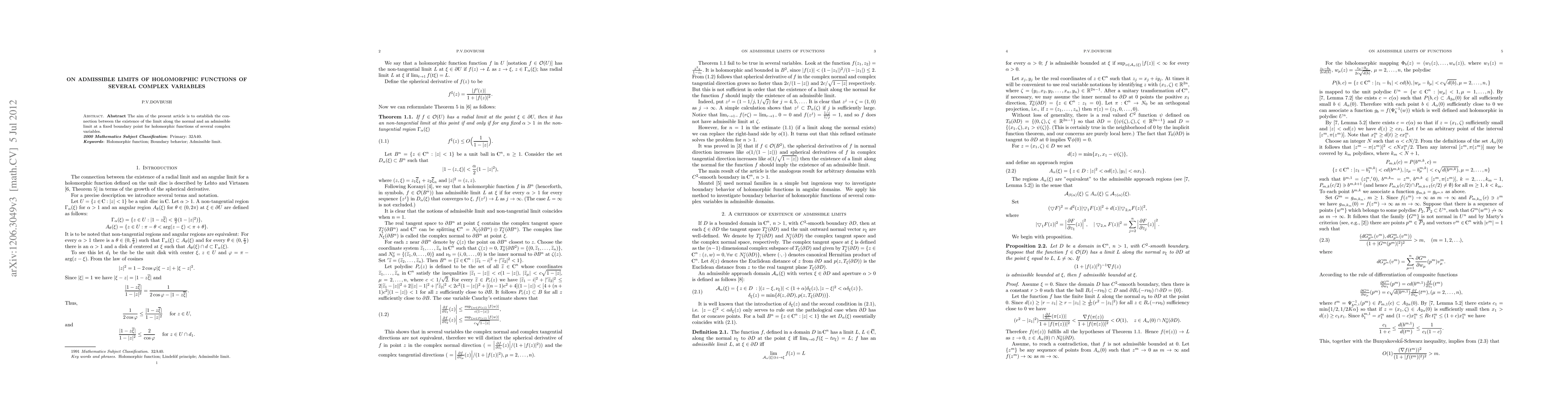 This paper explores the relationship between the existence of a limit along the normal and an admissible limit at a fixed boundary point for holomorphic functions of several complex variables, aiming to establish a connection in this mathematical context.