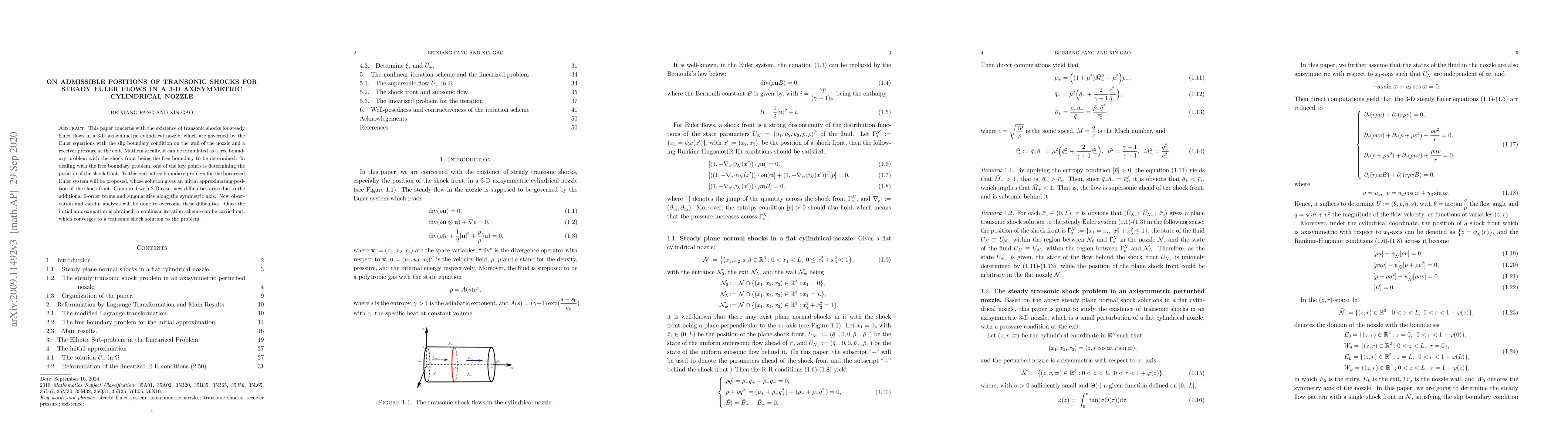 This paper investigates the existence of transonic shocks in steady Euler flows within a 3-D axisymmetric cylindrical nozzle, proposing a free boundary problem to determine the shock front. A linearized Euler system is used to obtain an initial shock position approximation, followed by a nonlinear iteration scheme to converge to the final solution.