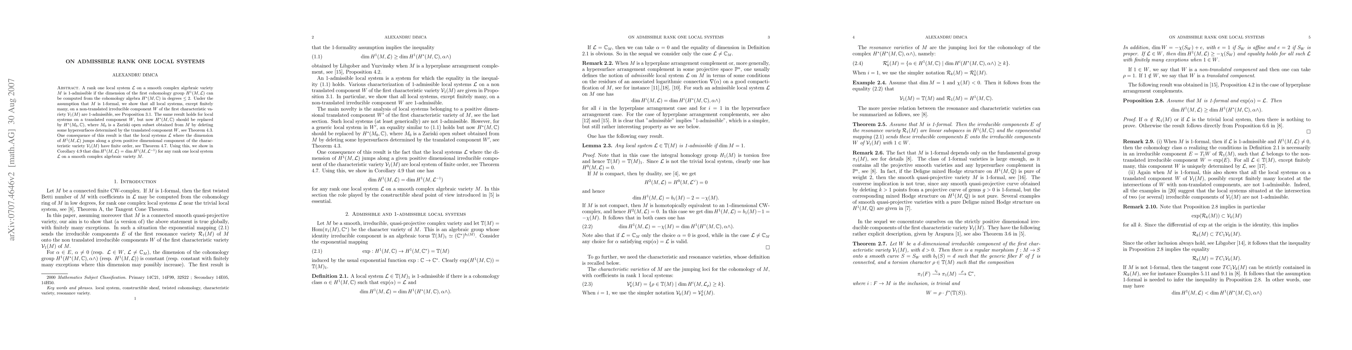 A rank one local system $\LL$ on a smooth complex algebraic variety $M$ is 1-admissible if the dimension of the first cohomology group $H^1(M,\LL)$ can be computed from the cohomology algebra $H^*(M,\C)$ in degrees $\leq 2$. Under the assumption that $M$ is 1-formal, we show that all local systems, except finitely many, on a non-translated irreducible component $W$ of the first characteristic variety $\V_1(M)$ are 1-admissible, see Proposition 3.1. The same result holds for local systems on a translated component $W$, but now $H^*(M,\C)$ should be replaced by $H^*(M_0,\C)$, where $M_0$ is a Zariski open subset obtained from $M$ by deleting some hypersurfaces determined by the translated component $W$, see Theorem 4.3.