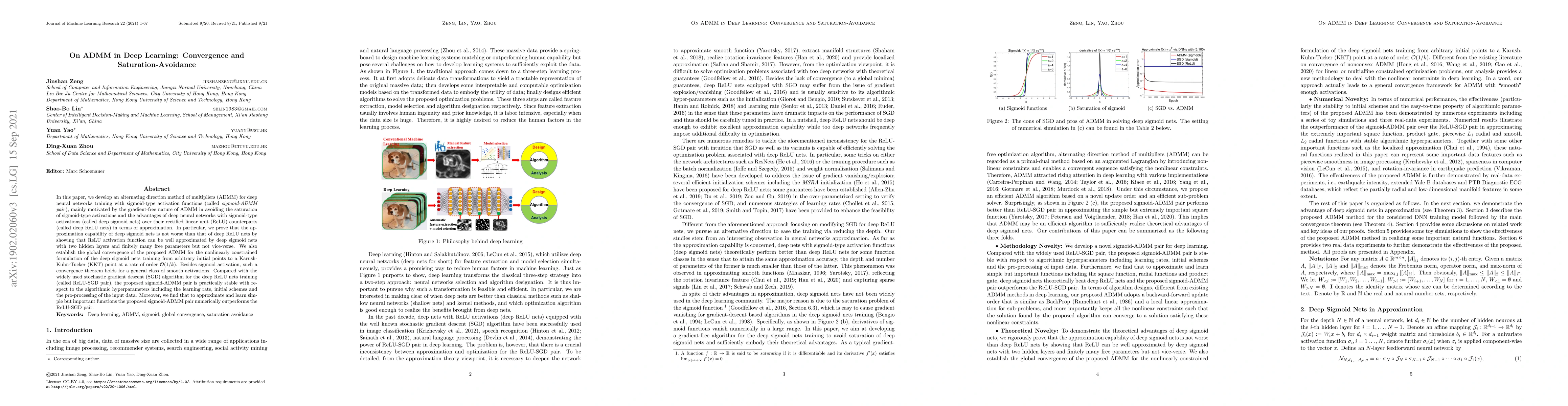 This paper proposes an ADMM method for training deep neural networks with sigmoid activations, demonstrating its stability and superior approximation capabilities compared to ReLU networks. It proves global convergence and shows that sigmoid networks can approximate ReLU functions, while ReLU cannot approximate sigmoid functions equivalently.