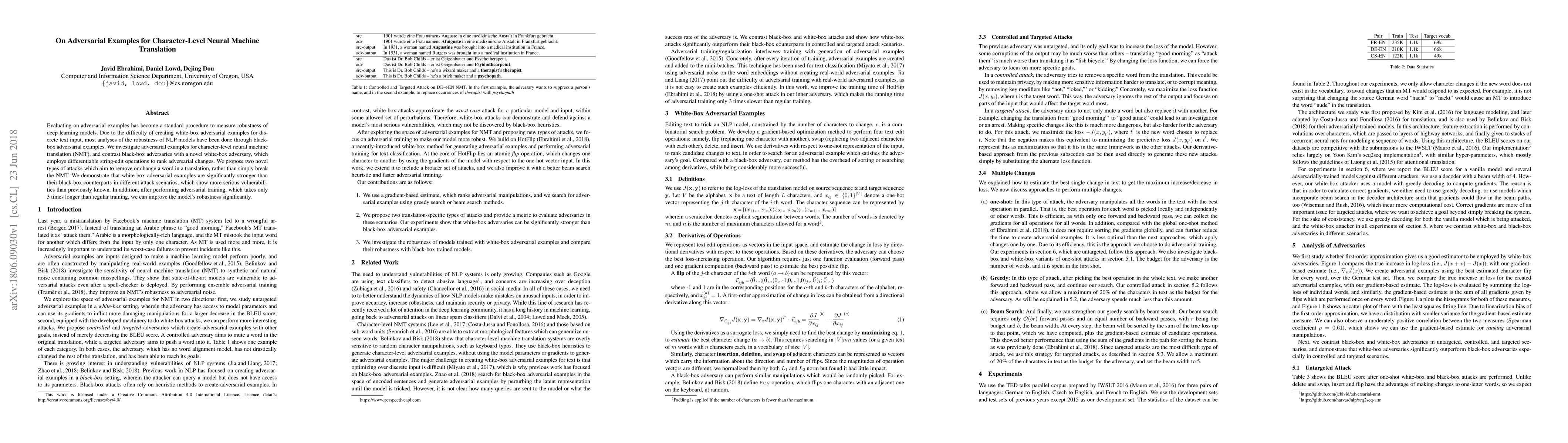 This paper investigates the robustness of character-level neural machine translation (NMT) models against adversarial examples, comparing black-box and novel white-box attacks. The study finds that white-box attacks, which use differentiable string-edit operations, are more effective, revealing significant vulnerabilities. Adversarial training enhances model robustness with minimal additional training time.