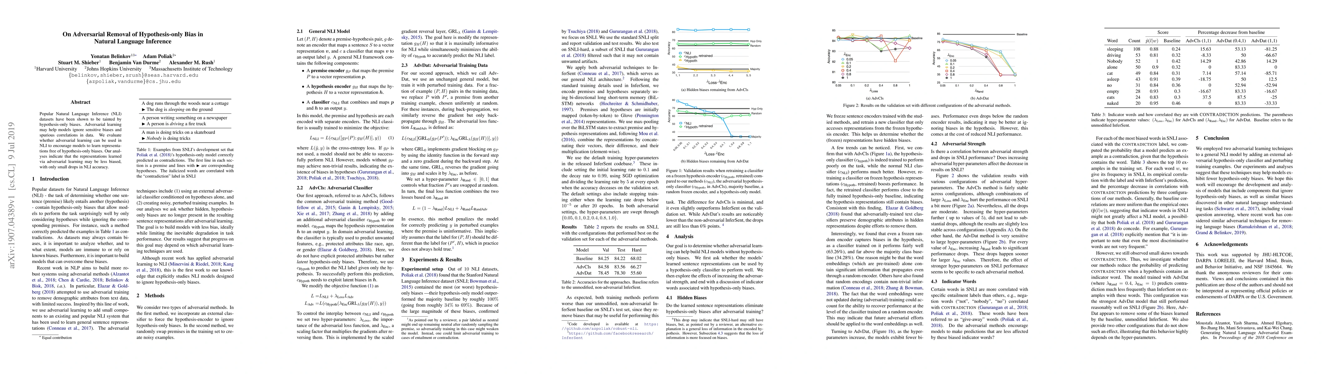 This paper investigates the use of adversarial learning to mitigate hypothesis-only biases in Natural Language Inference (NLI) datasets. The results show that adversarial learning can reduce bias in model representations with minimal impact on NLI accuracy.