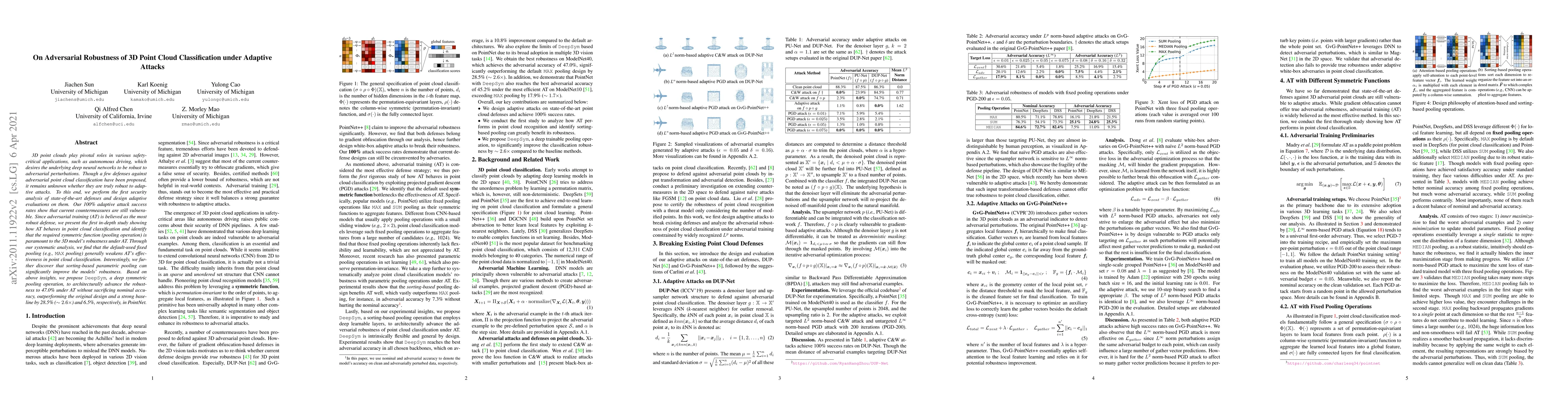 This paper investigates the robustness of 3D point cloud classification models against adaptive attacks, revealing that current defenses fail under such attacks. The study introduces DeepSym, a deep symmetric pooling method, which significantly enhances the robustness of point cloud classification models by 47% under adversarial training.