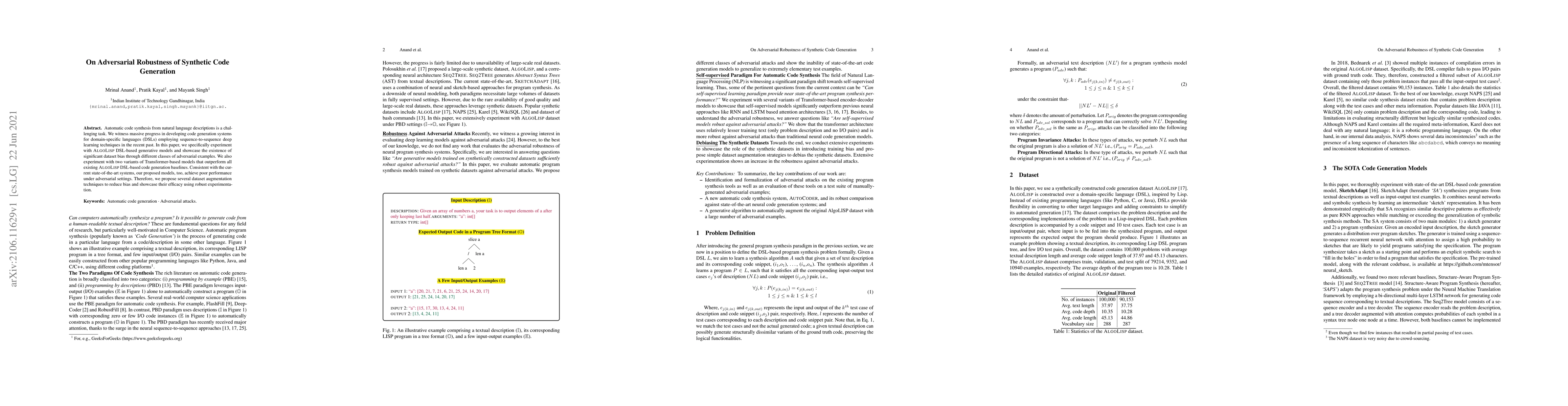 This paper investigates the adversarial robustness of synthetic code generation using \textsc{AlgoLisp} DSL, revealing significant dataset bias and poor performance under adversarial attacks. The authors propose dataset augmentation techniques to mitigate bias and demonstrate their effectiveness through robust experimentation.