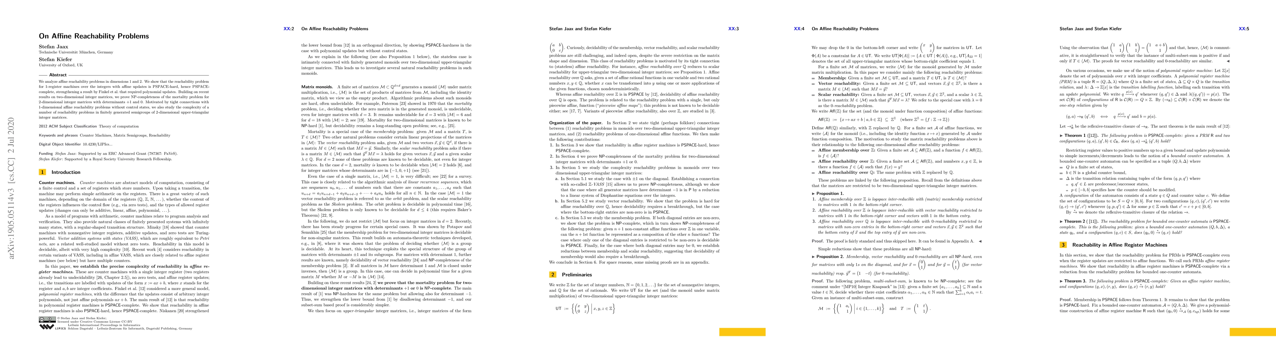 We analyze affine reachability problems in dimensions 1 and 2. We show that the reachability problem for 1-register machines over the integers with affine updates is PSPACE-hard, hence PSPACE-complete, strengthening a result by Finkel et al. that required polynomial updates. Building on recent results on two-dimensional integer matrices, we prove NP-completeness of the mortality problem for 2-dimensional integer matrices with determinants +1 and 0. Motivated by tight connections with 1-dimensional affine reachability problems without control states, we also study the complexity of a number of reachability problems in finitely generated semigroups of 2-dimensional upper-triangular integer matrices.