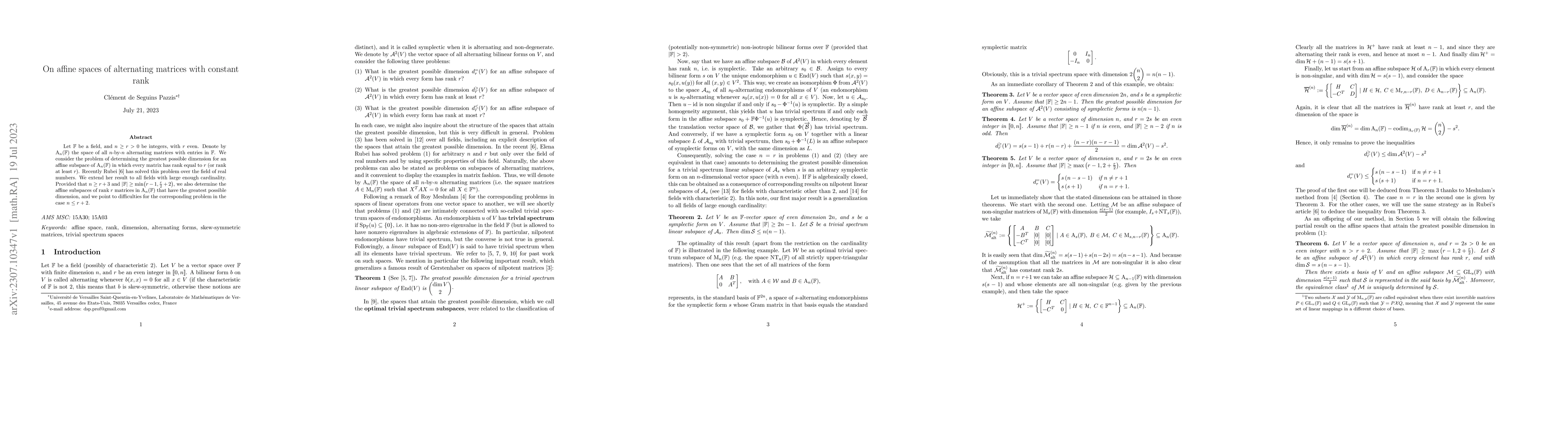 Let $\mathbb{F}$ be a field, and $n \geq r>0$ be integers, with $r$ even. Denote by $\mathrm{A}_n(\mathbb{F})$ the space of all $n$-by-$n$ alternating matrices with entries in $\mathbb{F}$. We consider the problem of determining the greatest possible dimension for an affine subspace of $\mathrm{A}_n(\mathbb{F})$ in which every matrix has rank equal to $r$ (or rank at least $r$). Recently Rubei has solved this problem over the field of real numbers. We extend her result to all fields with large enough cardinality. Provided that $n \geq r+3$ and $|\mathbb{F}|\geq \min\bigl(r-1,\frac{r}{2}+2\bigr)$, we also determine the affine subspaces of rank $r$ matrices in $\mathrm{A}_n(\mathbb{F})$ that have the greatest possible dimension, and we point to difficulties for the corresponding problem in the case $n\leq r+2$.