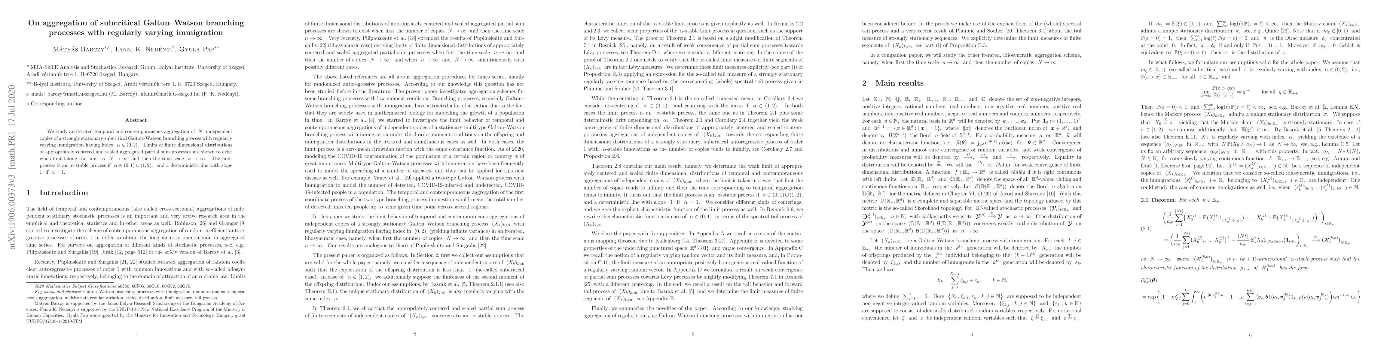 This paper investigates the aggregation of $N$ independent subcritical Galton-Watson branching processes with regularly varying immigration, showing that the limits of finite-dimensional distributions of aggregated partial sums converge to an $\alpha$-stable process for $\alpha \in (0, 1) \cup (1, 2)$ or a deterministic line for $\alpha = 1$.
