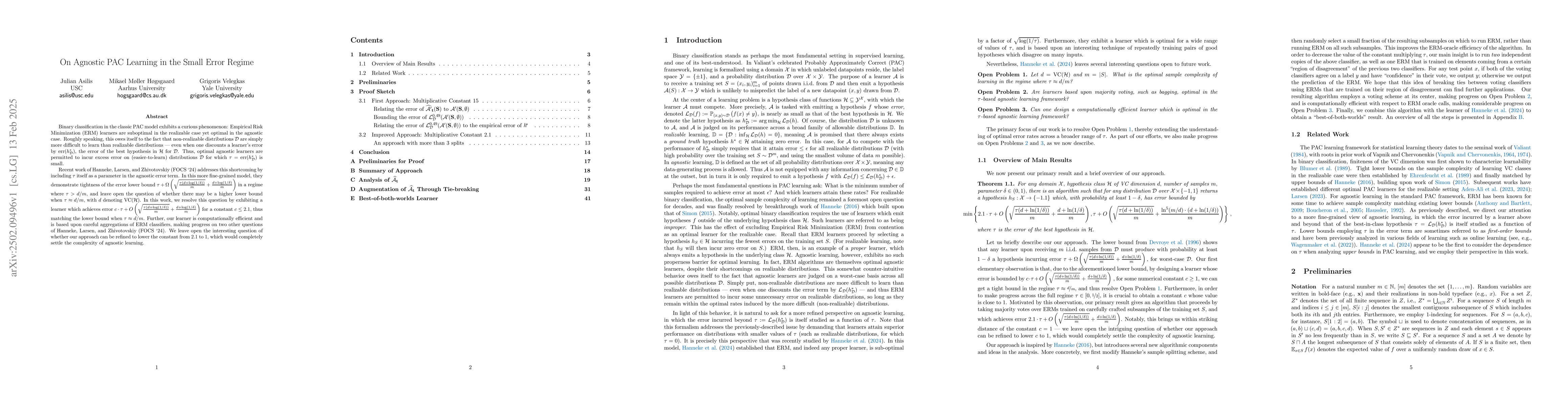 This paper addresses the agnostic PAC learning problem in the small error regime, demonstrating a new learner that achieves error close to a proven lower bound when the realizable error $\tau$ is approximately equal to the VC dimension $d$ divided by the sample size $m$. The learner uses aggregations of Empirical Risk Minimization classifiers, matching the lower bound and offering computational efficiency. The authors suggest potential for further refinement to improve the constant factor.