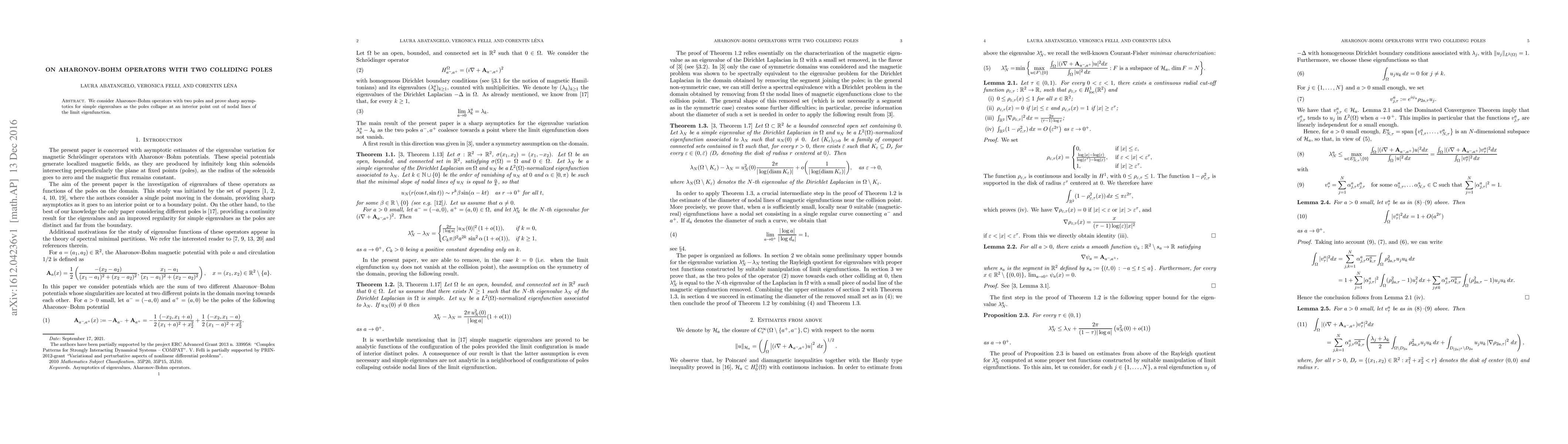 Summary: This paper investigates Aharonov-Bohm operators with two colliding poles and establishes precise asymptotic behavior for simple eigenvalues as the poles converge at a specified interior point, avoiding the nodal lines of the resulting limit eigenfunction.