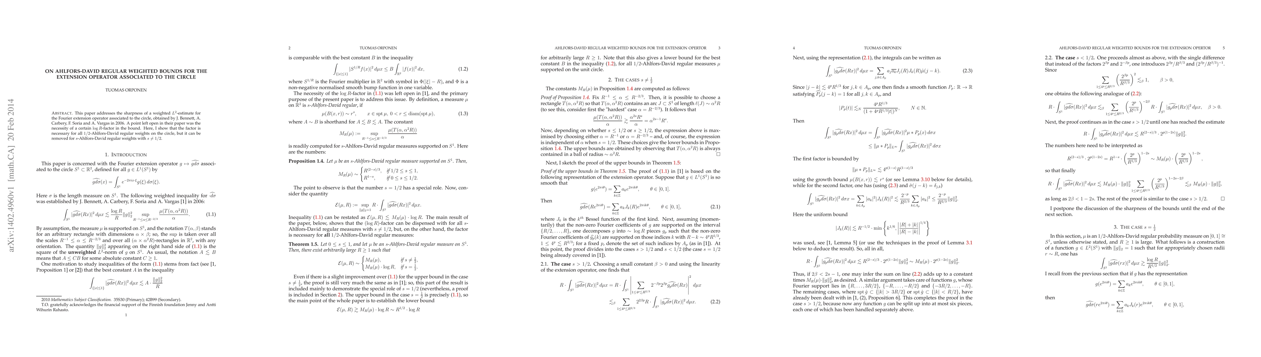 This paper confirms the necessity of a $\log R$-factor in the $L^{2}$-estimate for Fourier extension operators associated with the circle for $1/2$-Ahlfors-David regular weights, while demonstrating its removability for other $s$-Ahlfors-David regular weights where $s \neq 1/2$.