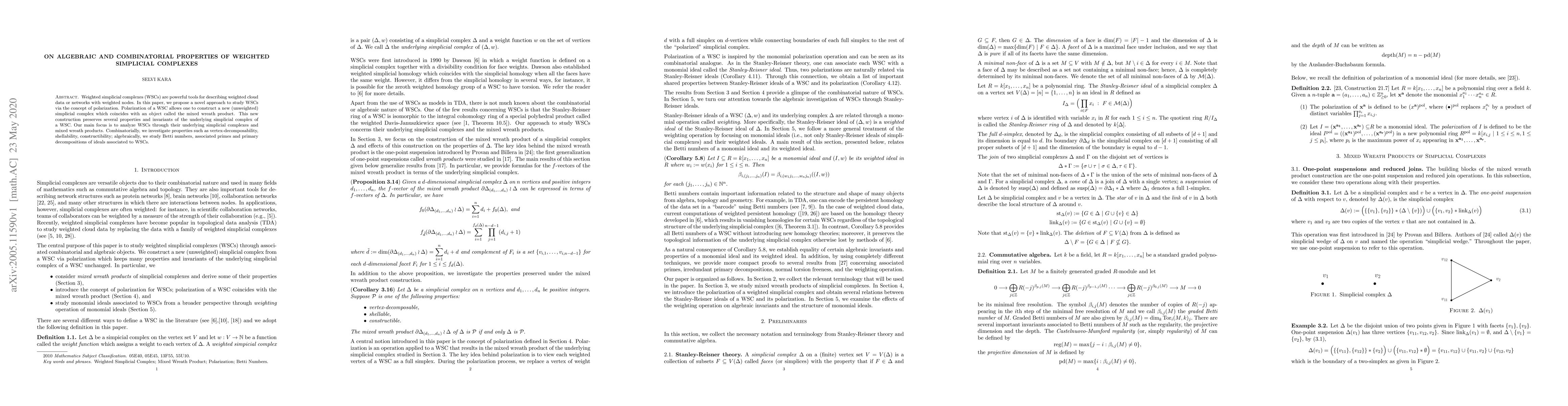 This paper introduces a novel method to study weighted simplicial complexes (WSCs) using polarization, which constructs an unweighted simplicial complex equivalent to the mixed wreath product. The study explores combinatorial properties like vertex-decomposability and shellability, and algebraic aspects such as Betti numbers and primary decompositions of associated ideals.