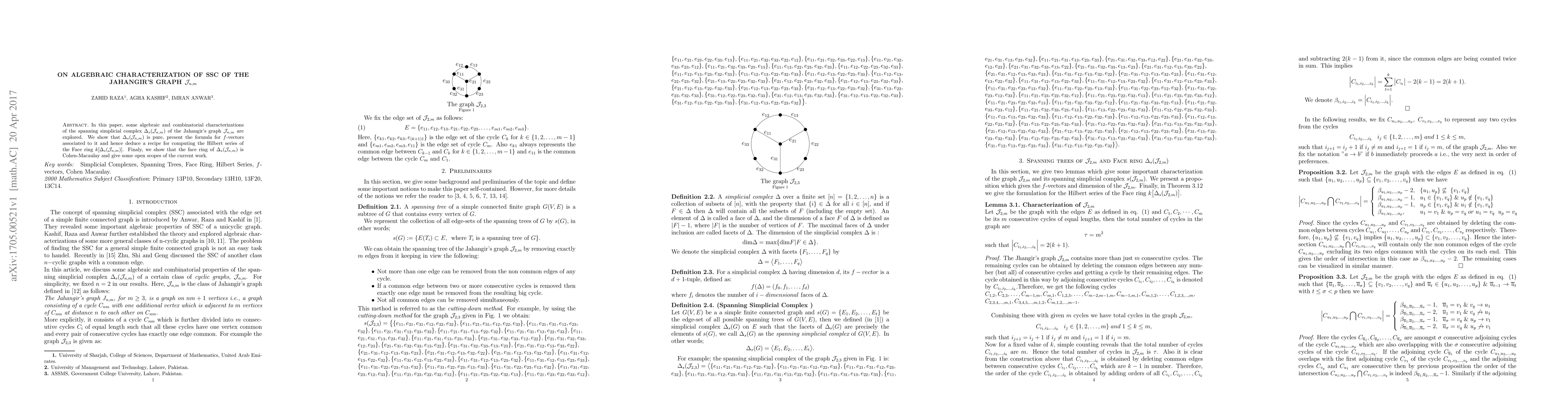 This paper explores algebraic and combinatorial properties of the spanning simplicial complex $\Delta_s(\mathcal{J}_{n,m})$ of Jahangir's graph $\mathcal{J}_{n,m}$, proving its purity, presenting $f$-vectors, and computing its Hilbert series. It also demonstrates that the face ring of $\Delta_s(\mathcal{J}_{n,m})$ is Cohen-Macaulay.