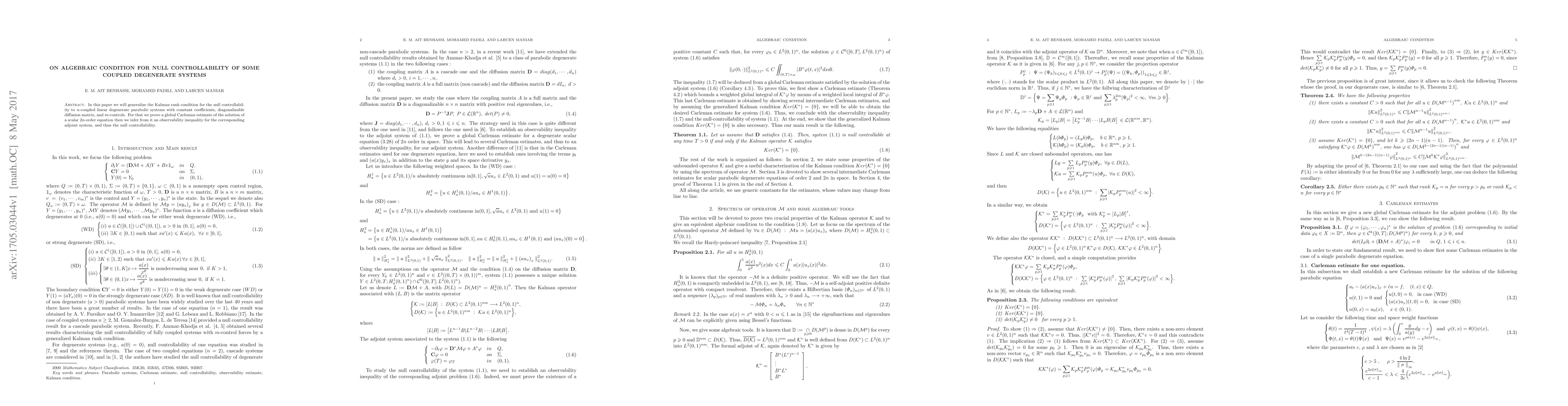 This paper generalizes the Kalman rank condition for null controllability to $n$-coupled degenerate linear parabolic systems, proving a global Carleman estimate for a scalar $2n$-order equation, which leads to an observability inequality and thus establishes null controllability.