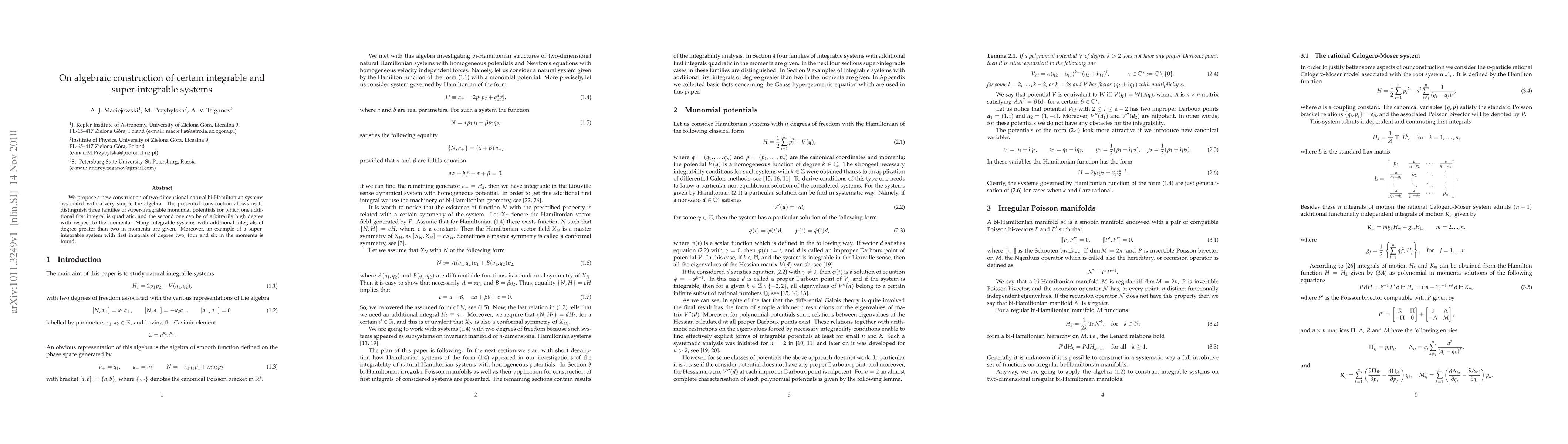 The paper introduces a new method to construct two-dimensional bi-Hamiltonian systems linked to a basic Lie algebra, revealing three families of super-integrable systems with specific potential structures, including systems with higher-degree integrals. An example is provided of a super-integrable system featuring first integrals of degrees two, four, and six in momenta.