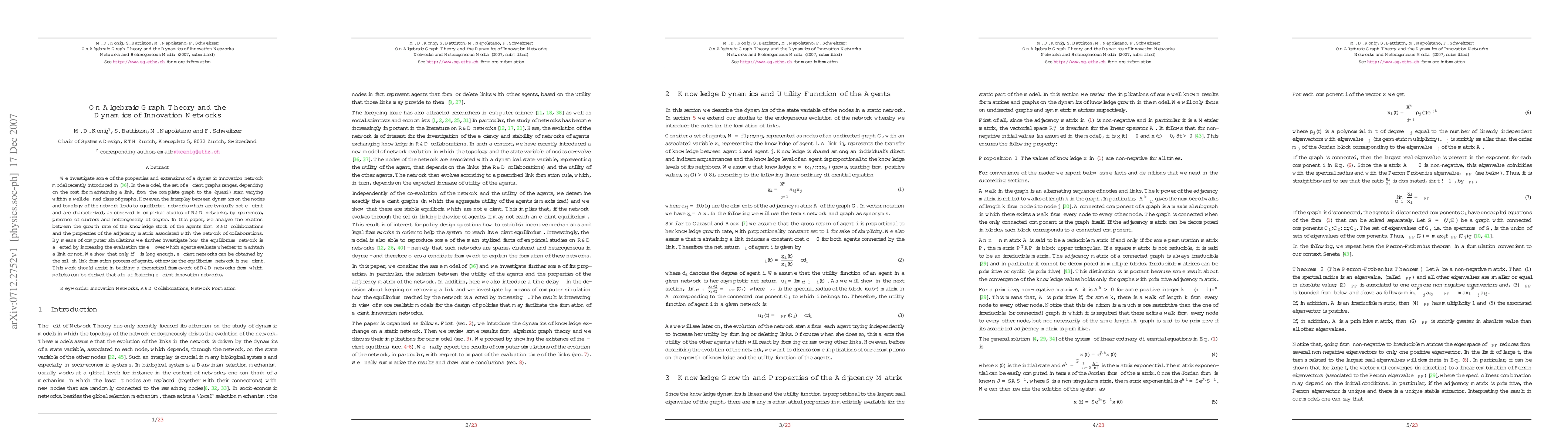 We investigate some of the properties and extensions of a dynamic innovation network model recently introduced in \citep{koenig07:_effic_stabil_dynam_innov_networ}. In the model, the set of efficient graphs ranges, depending on the cost for maintaining a link, from the complete graph to the (quasi-) star, varying within a well defined class of graphs. However, the interplay between dynamics on the nodes and topology of the network leads to equilibrium networks which are typically not efficient and are characterized, as observed in empirical studies of R&D networks, by sparseness, presence of clusters and heterogeneity of degree. In this paper, we analyze the relation between the growth rate of the knowledge stock of the agents from R&D collaborations and the properties of the adjacency matrix associated with the network of collaborations. By means of computer simulations we further investigate how the equilibrium network is affected by increasing the evaluation time $\tau$ over which agents evaluate whether to maintain a link or not. We show that only if $\tau$ is long enough, efficient networks can be obtained by the selfish link formation process of agents, otherwise the equilibrium network is inefficient. This work should assist in building a theoretical framework of R&D networks from which policies can be derived that aim at fostering efficient innovation networks.