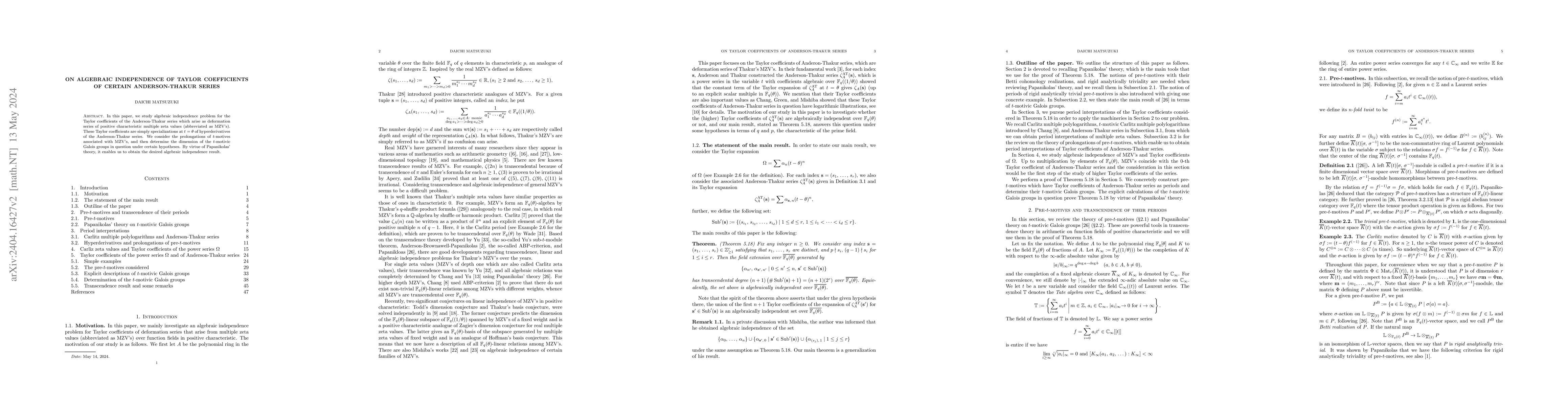 The paper investigates the algebraic independence of Taylor coefficients from Anderson-Thakur series, which arise from deformations of multiple zeta values. The authors utilize t-motive prolongations and t-motivic Galois groups, alongside Papanikolas' theory, to establish the algebraic independence of these coefficients.