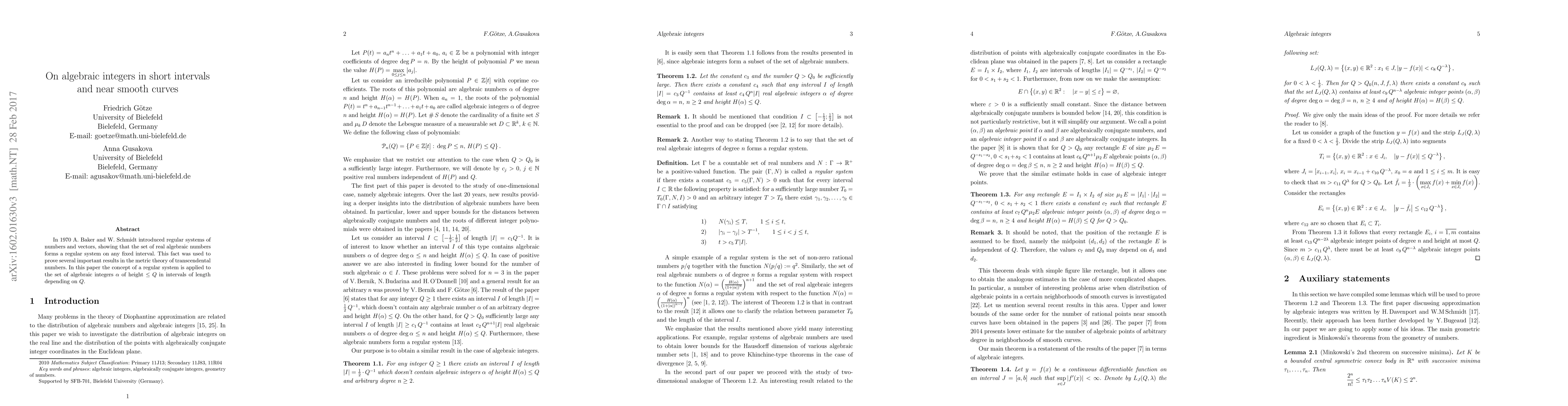 In 1970 A. Baker and W. Schmidt introduced regular systems of numbers and vectors, showing that the set of real algebraic numbers forms a regular system on any fixed interval. This fact was used to prove several important results in the metric theory of transcendental numbers. In this paper the concept of a regular system is applied to the set of algebraic integers $\alpha$ of height $\leq Q$ in intervals of length depending on $Q$.