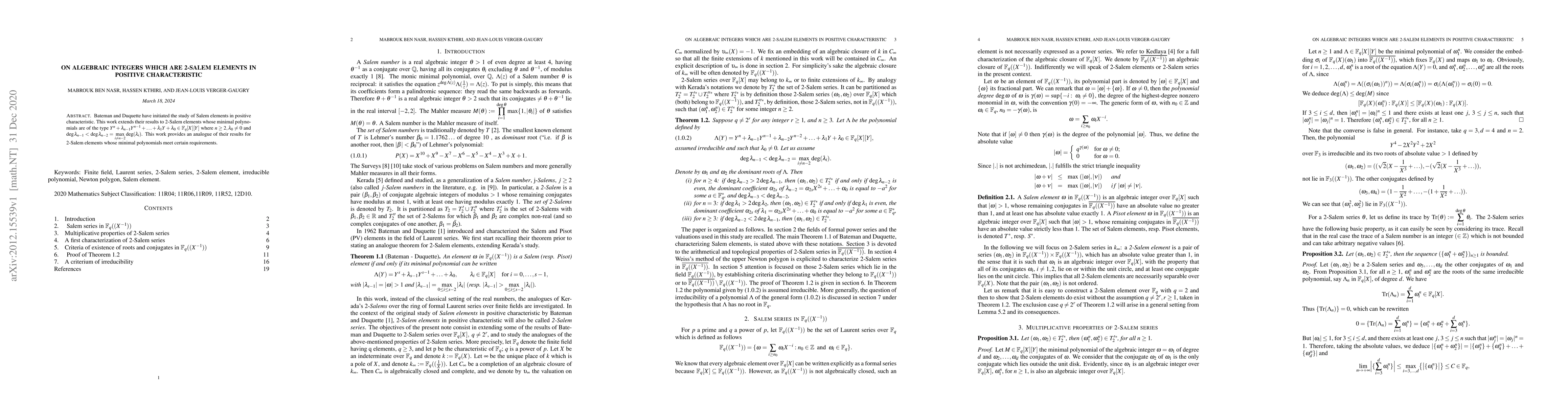 Bateman and Duquette have initiated the study of Salem elements in positive characteristic. This work extends their results to 2-Salem elements whose minimal polynomials are of the type $Y^n + \lambda_{n-1}Y^{n-1} + \ldots+\lambda_1Y + \lambda_0 \in \mathbb{F}_q[X][Y ]$ where $n \geq2, \lambda_0\neq 0$ and $\deg \lambda_{n-1} < \deg \lambda_{n-2} = \max_{i\neq n-2}\deg(\lambda_i)$. This work provides an analogue of their results for 2-Salem elements whose minimal polynomials meet certain requirements.