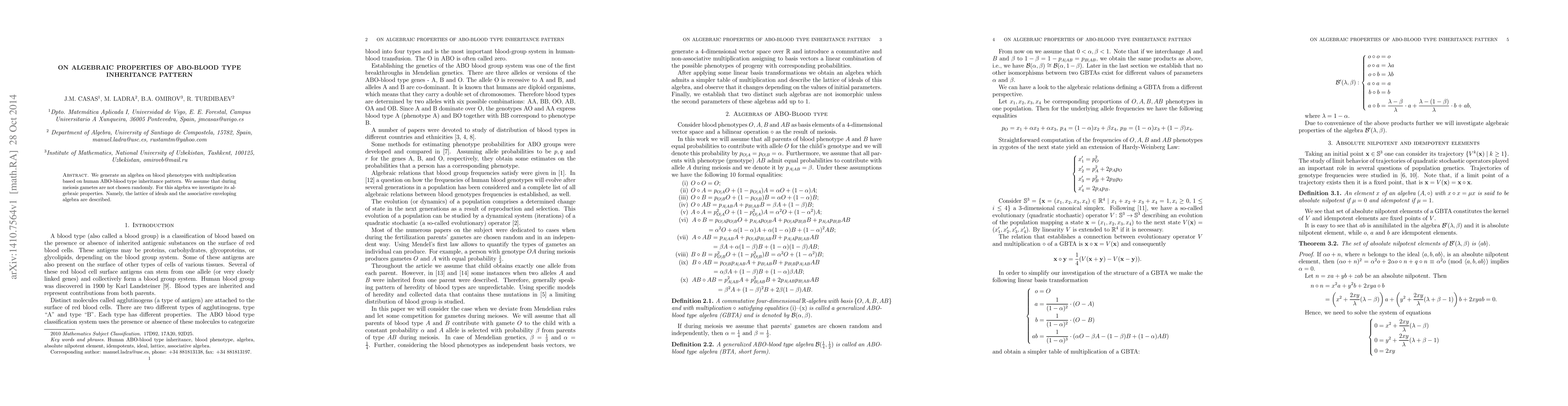 We generate an algebra on blood phenotypes with multiplication based on human ABO-blood type inheritance pattern. We assume that during meiosis gametes are not chosen randomly. For this algebra we investigate its algebraic properties. Namely, the lattice of ideals and the associative enveloping algebra are described.