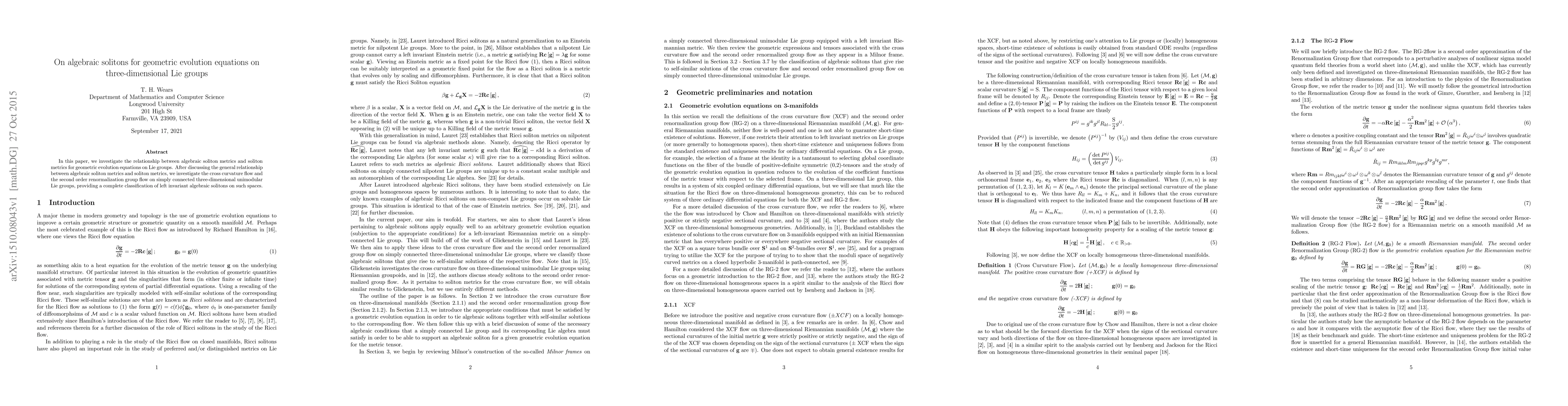 This paper explores the connection between algebraic soliton metrics and soliton metrics for geometric evolution equations on three-dimensional Lie groups, classifying left-invariant algebraic solitons for the cross curvature flow and second order renormalization group flow on simply connected three-dimensional unimodular Lie groups.
