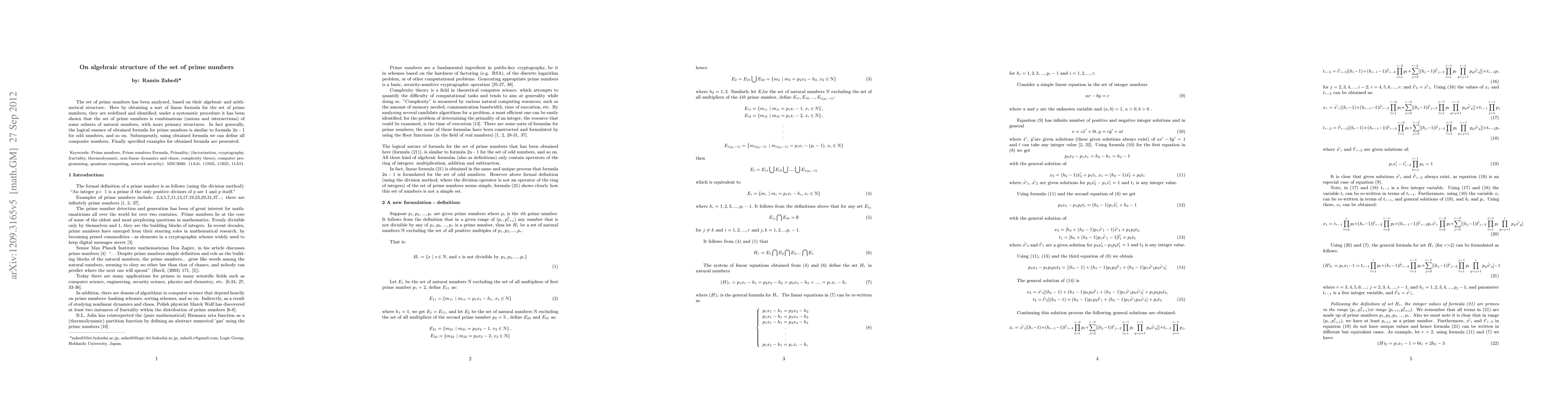 The set of prime numbers has been analyzed, based on their algebraic and arithmetical structure. Here by obtaining a sort of linear formula for the set of prime numbers, they are redefined and identified; under a systematic procedure it has been shown that the set of prime numbers is combinations (unions and intersections) of some subsets of natural numbers, with more primary structures. In fact generally, the logical essence of obtained formula for prime numbers is similar to formula 2n - 1 for odd numbers, and so on. Subsequently, using obtained formula we can define all composite numbers. Finally specified examples for obtained formula are presented.