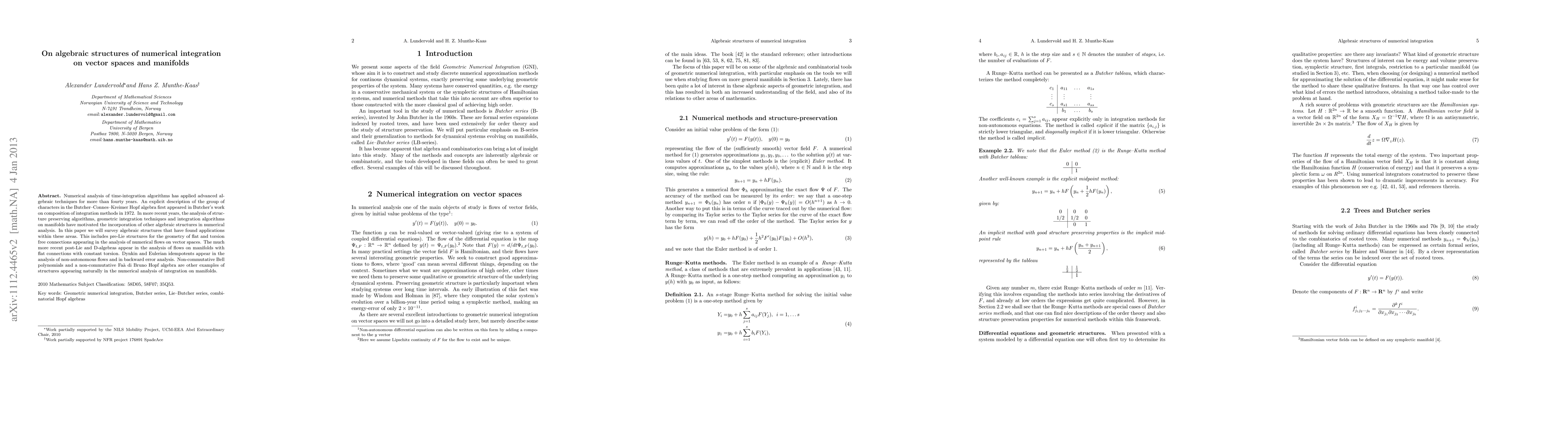 This paper surveys algebraic structures applied to numerical integration on vector spaces and manifolds, including pre-Lie, post-Lie, and D-algebras for flows on manifolds, and non-commutative Bell polynomials for analyzing non-autonomous flows. The focus is on how these advanced algebraic techniques enhance the analysis and composition of integration methods in numerical analysis.