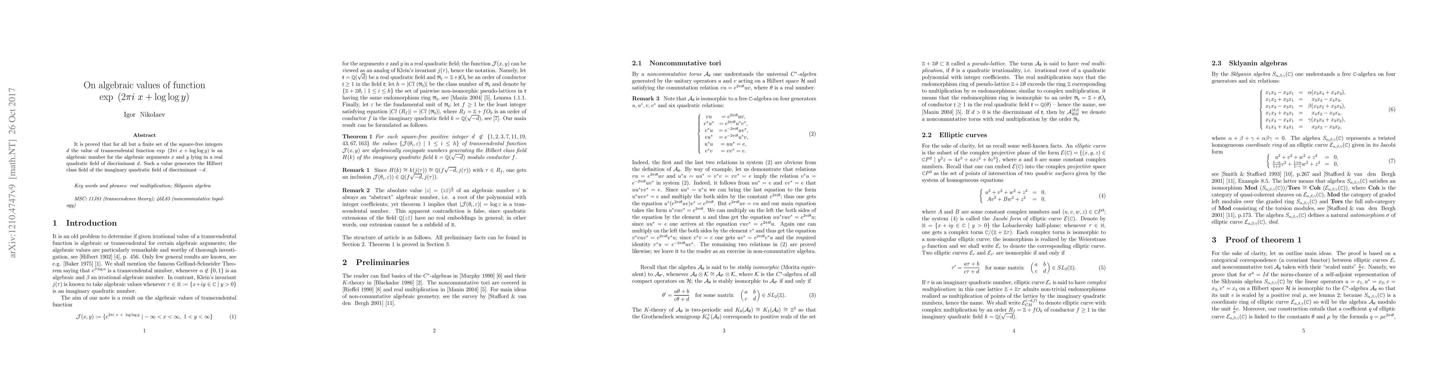 It is proved that for all but a finite set of the square-free integers $d$ the value of transcendental function $\exp~(2\pi i ~x+\log\log y)$ is an algebraic number for the algebraic arguments $x$ and $y$ lying in a real quadratic field of discriminant $d$. Such a value generates the Hilbert class field of the imaginary quadratic field of discriminant $-d$.