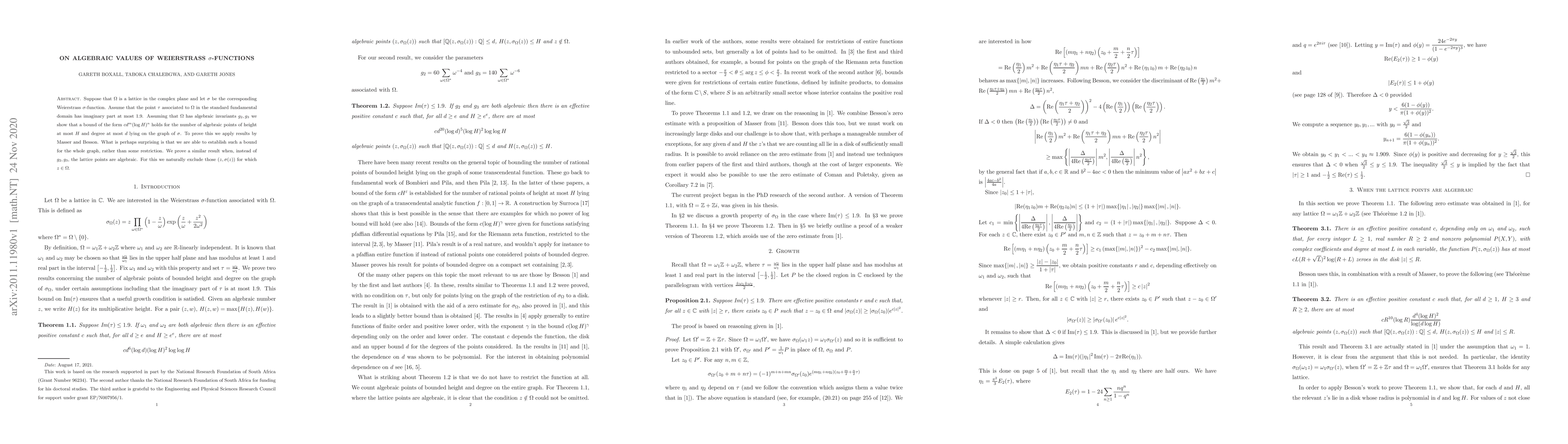Suppose that $\Omega$ is a lattice in the complex plane and let $\sigma$ be the corresponding Weierstrass $\sigma$-function. Assume that the point $\tau$ associated to $\Omega$ in the standard fundamental domain has imaginary part at most 1.9. Assuming that $\Omega$ has algebraic invariants $g_2,g_3$ we show that a bound of the form $c d^m (\log H)^n$ holds for the number of algebraic points of height at most $H$ and degree at most $d$ lying on the graph of $\sigma$. To prove this we apply results by Masser and Besson. What is perhaps surprising is that we are able to establish such a bound for the whole graph, rather than some restriction. We prove a similar result when, instead of $g_2,g_3$, the lattice points are algebraic. For this we naturally exclude those $(z,\sigma(z))$ for which $z\in\Omega$.