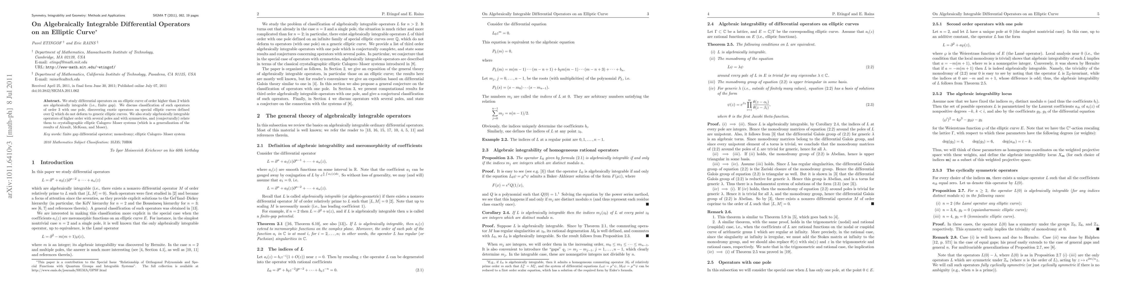 This paper classifies algebraically integrable differential operators of order 3 on elliptic curves, identifying exotic operators on special curves over ${\mathbb Q}$ that do not deform to generic elliptic curves. It also explores higher-order operators with symmetries and conjectures their relation to crystallographic elliptic Calogero-Moser systems.