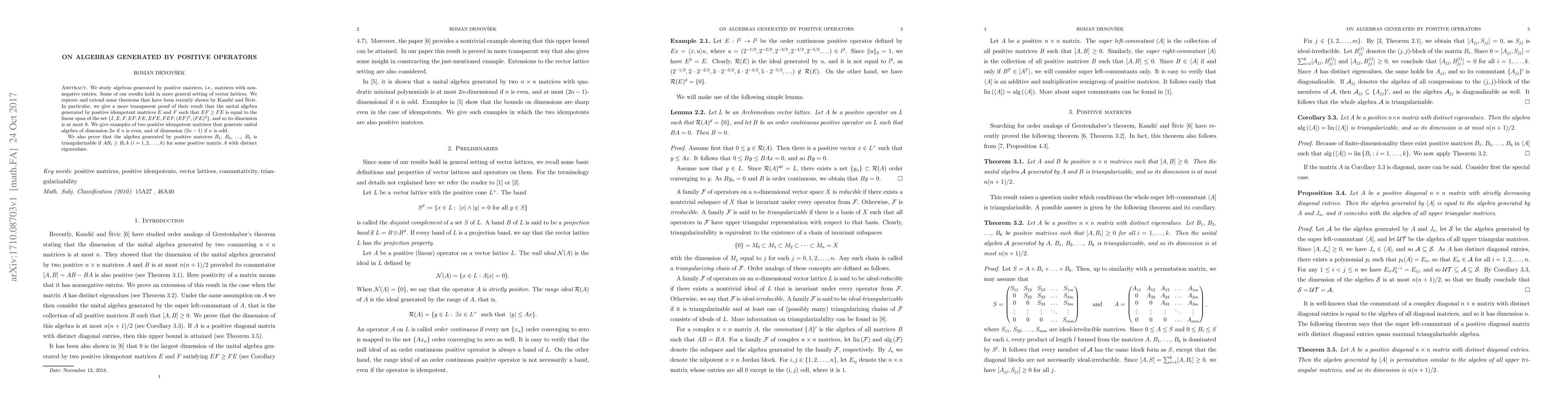 We study algebras generated by positive matrices, i.e., matrices with nonnegative entries. Some of our results hold in more general setting of vector lattices. We reprove and extend some theorems that have been recently shown by Kandi\'{c} and \v{S}ivic. In particular, we give a more transparent proof of their result that the unital algebra generated by positive idempotent matrices $E$ and $F$ such that $E F \ge F E$ is equal to the linear span of the set $\{I, E, F, E F, F E, E F E, F E F, (E F)^2, (F E)^2\}$, and so its dimension is at most $9$. We give examples of two positive idempotent matrices that generate unital algebra of dimension $2n$ if $n$ is even, and of dimension $(2n - 1)$ if $n$ is odd. We also prove that the algebra generated by positive matrices $B_1$, $B_2$, $\ldots$, $B_k$ is triangularizable if $A B_i \ge B_i A$ ($i=1,2, \ldots, k$) for some positive matrix $A$ with distinct eigenvalues.