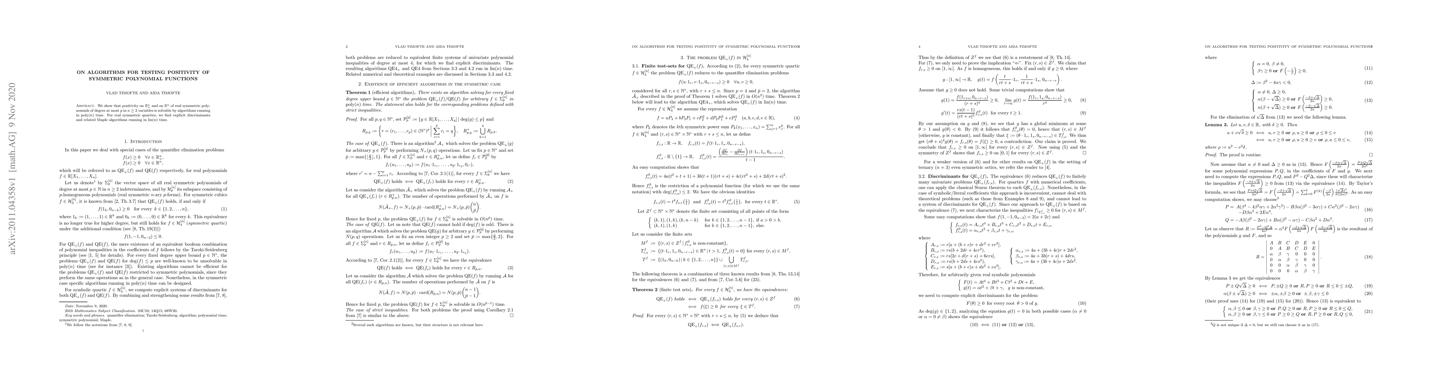 We show that positivity on $\mathbb{R}_+^n$ and on $\mathbb{R}^n$ of real symmetric polynomials of degree at most $p$ in $n\ge2$ variables is solvable by algorithms running in $\mathrm{poly}(n)$ time. For real symmetric quartics, we find explicit discriminants and related Maple algorithms running in $\mathrm{lin}(n)$ time.