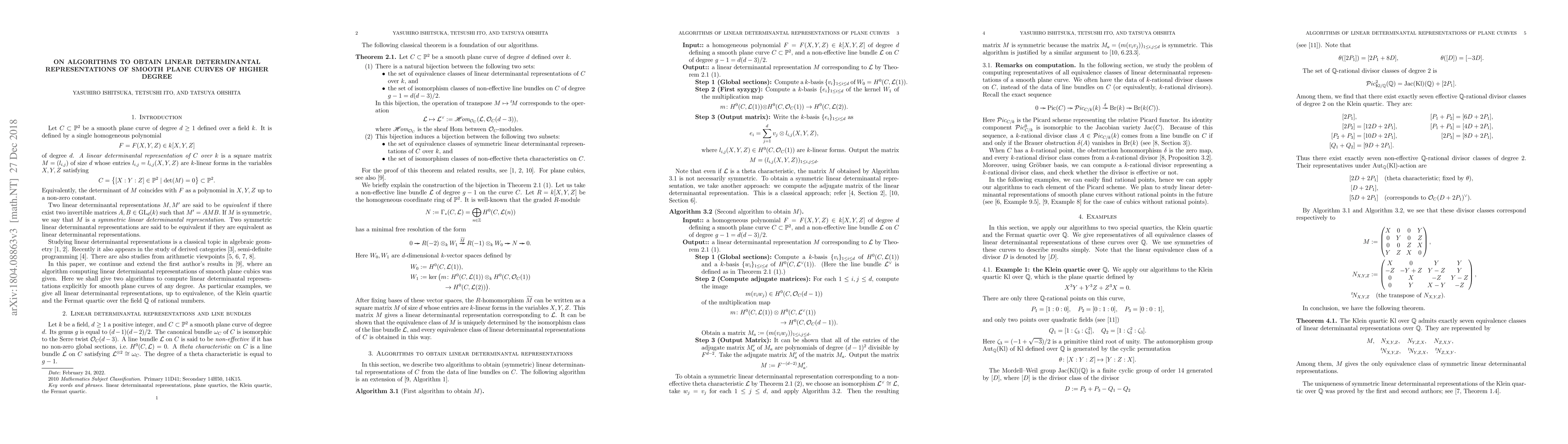 This paper presents two algorithms to compute linear determinantal representations for smooth plane curves of any degree over any field, with specific examples for the Klein and Fermat quartics over the rationals. The full details of the algorithms and results will be published separately.